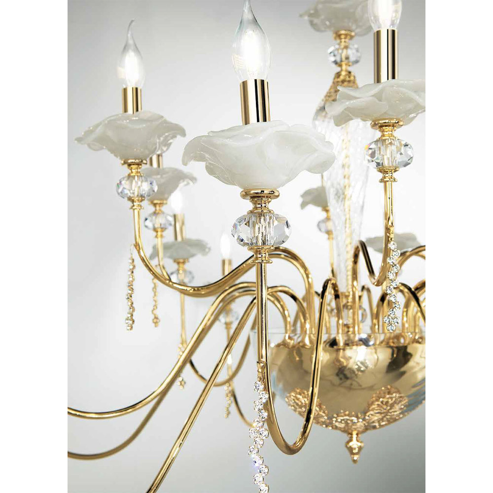 What makes it unique and majestic are the buds made of handcrafted glass of the highest quality and the jewel details in crystal that recall the drops of dew, also handmade, which give life to a classic style of the past, whose charm becomes the protagonist in the destination space.