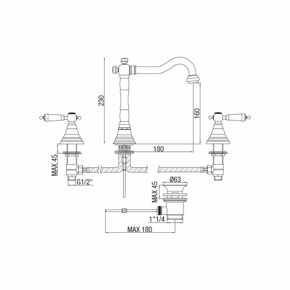 Classic design brass 3-hole basin mixer Made in Italy.