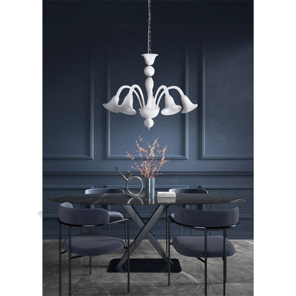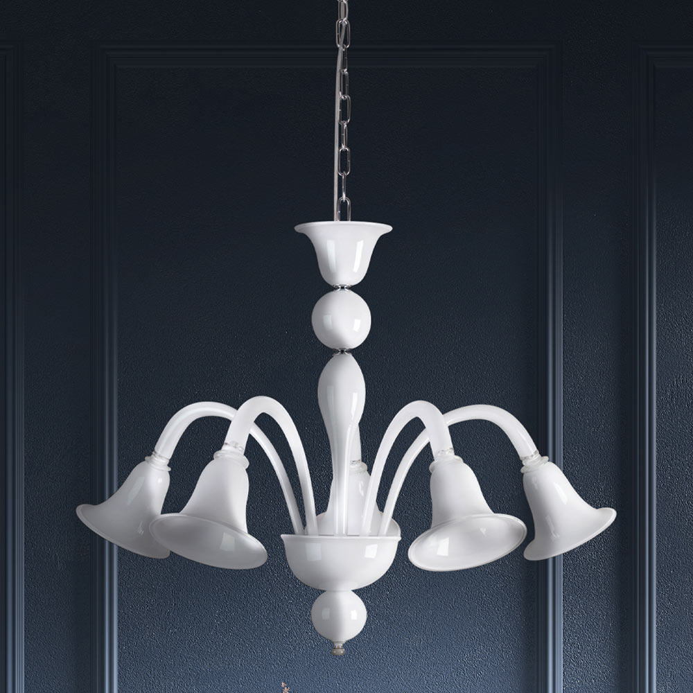 of hand-blown Venetian white glass characterized by soft shapes and harmonious queues that give life to lighting with refined elegance and great personality.