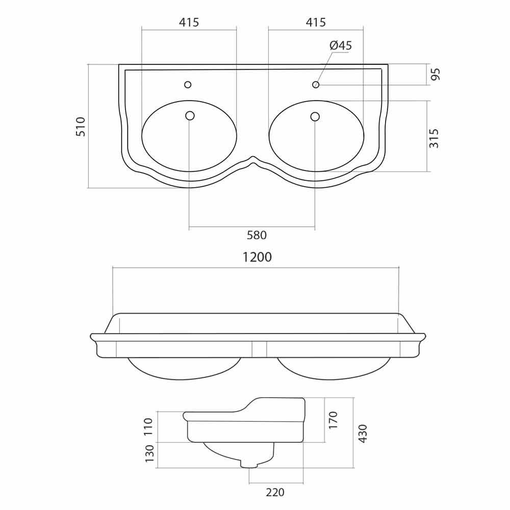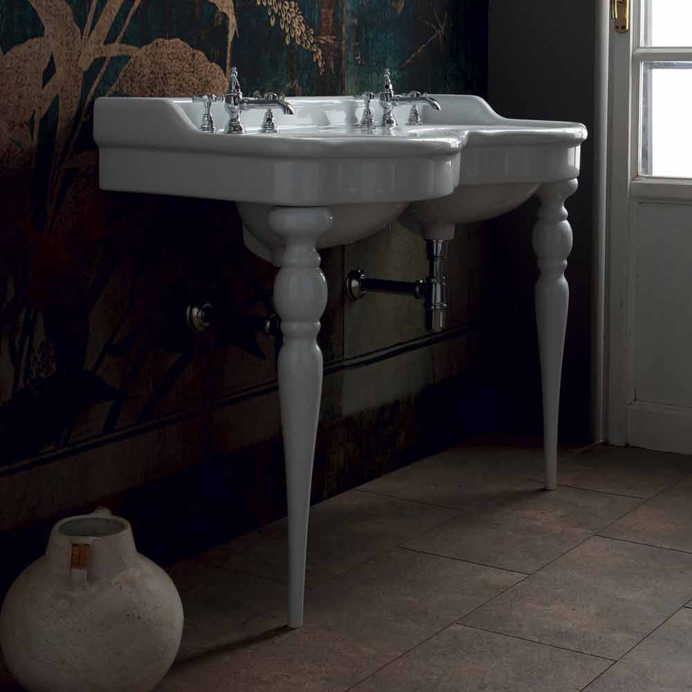 Countertop console washbasin with double basin made entirely of white ceramic.