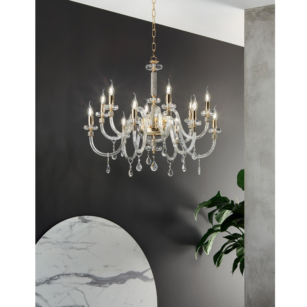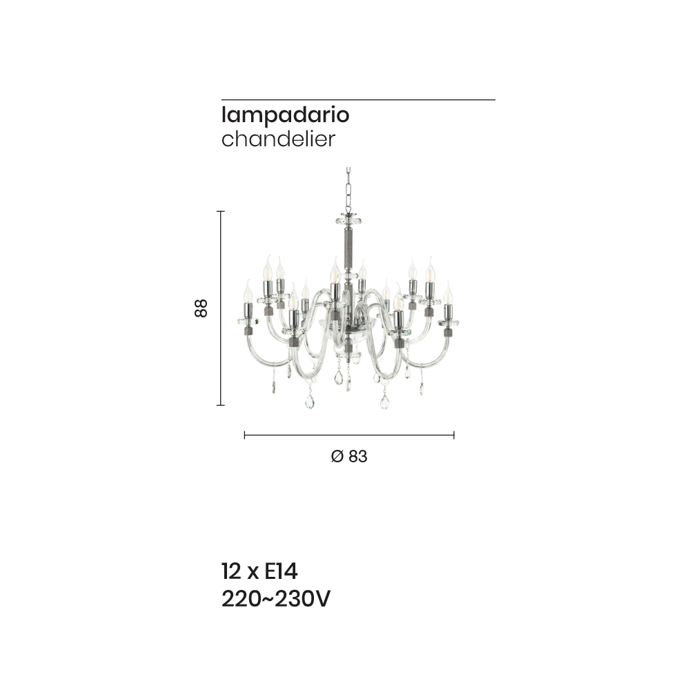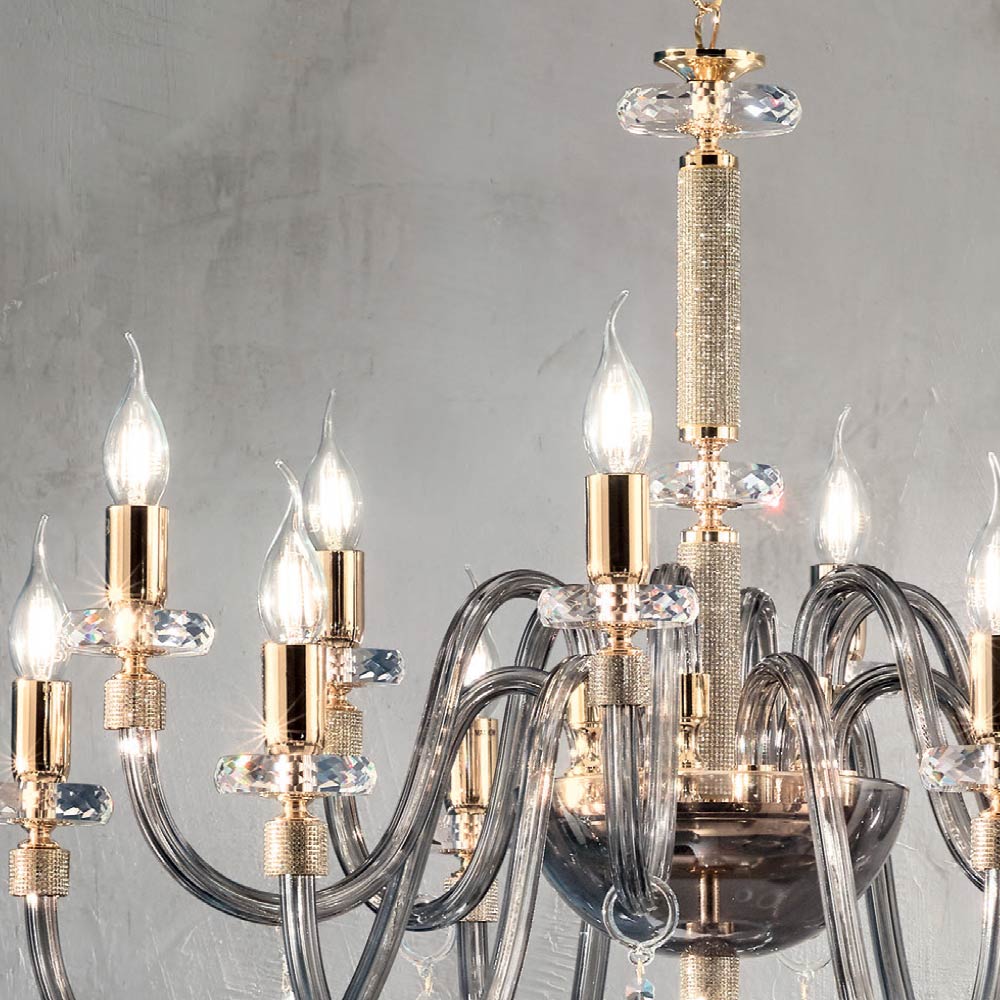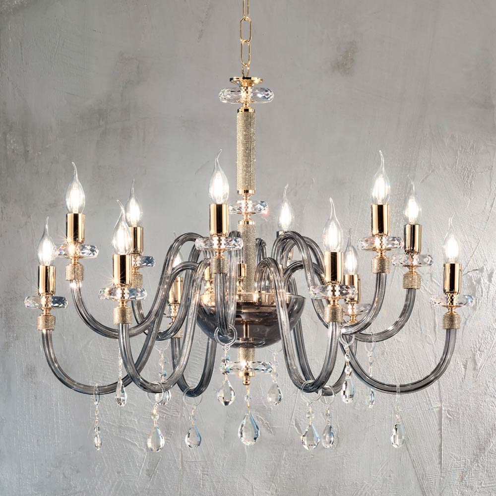 This classic style pendant chandelier is made up of 12 arched arms made of hand-crafted glass in Italy with a "rigaton" effect, the end of which is surrounded by glitter set in the metal, as is the central part of the complement, where two circular tubes they support the structure interspersed with two circular discs of different sizes made of ground crystal.