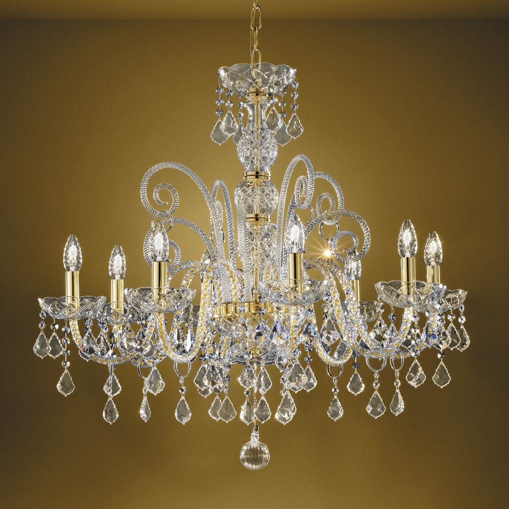 8-light Venice glass chandelier in crystal finish with lead pendants and shiny golden metal . Made through a craftsmanship , this complement is characterized by the wonderful arms worked by hand through the twisting technique which creates an exclusive result that aesthetically recalls the intertwining of a rope, giving personality to the chandelier. A real rain of light invades the structure of the chandelier and then spreads into the surrounding environment by means of refraction through the magic of sequins and crystal pendants with fine finishes, thus creating an evocative and dreamlike scenographic effect capable of enchanting and surprising. for its elegance and majesty .