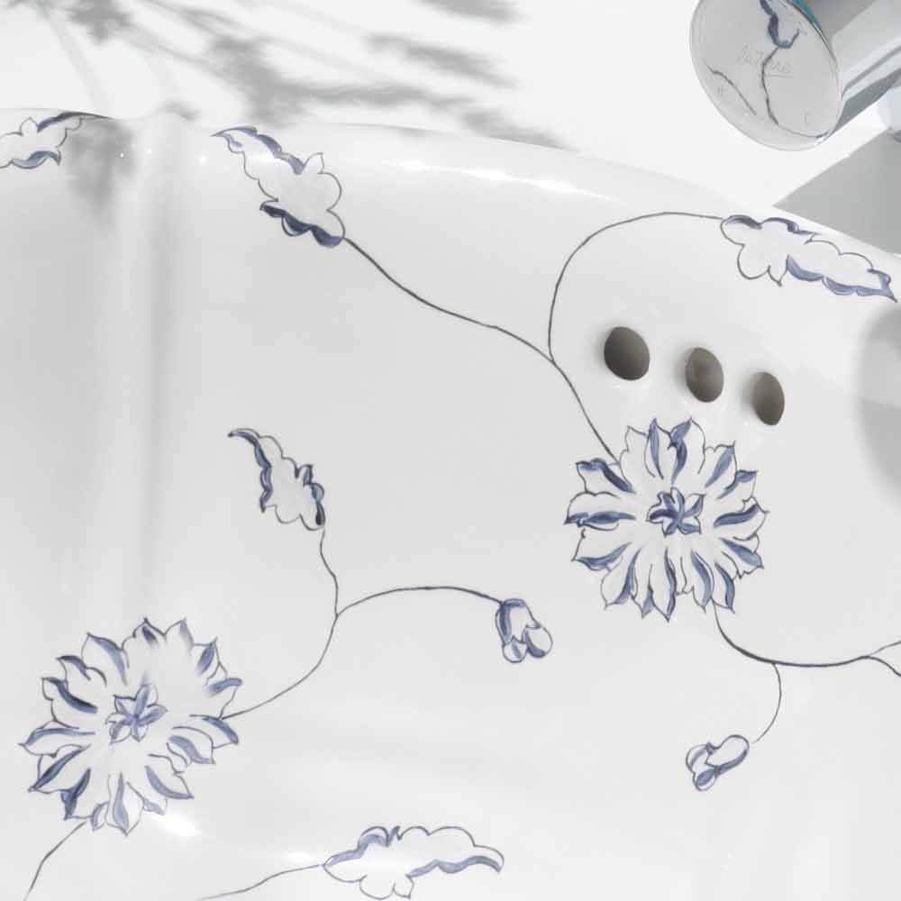 Built-in bathroom sink made in Italy in fine white porcelain with decorations of blue flowers handmade using the brush technique.