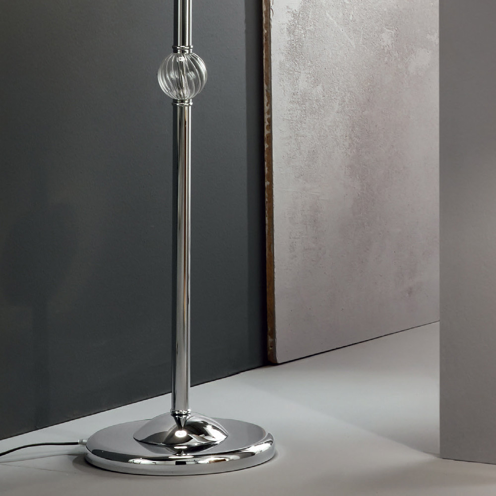This classic style floor lamp is made with a round base and part of the structure made of chromed metal.