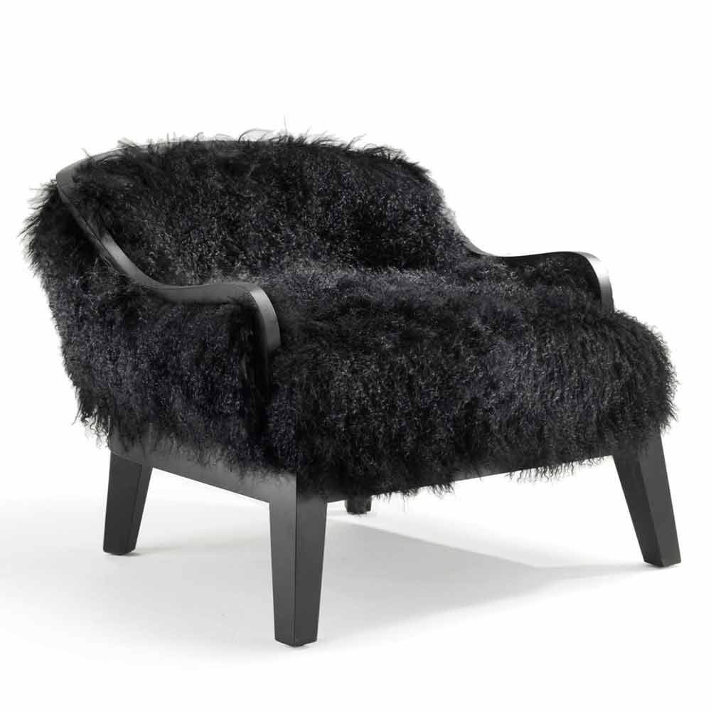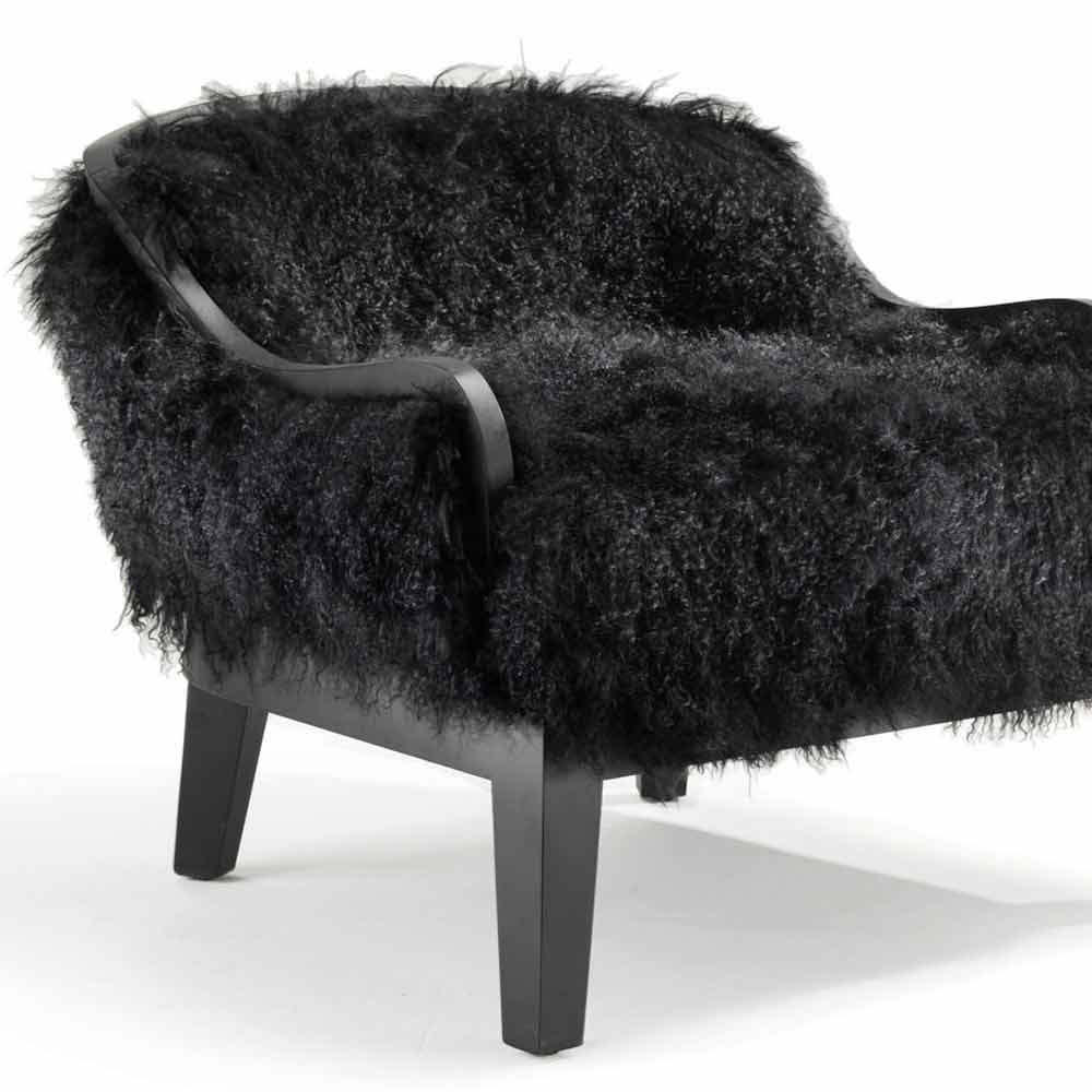 Low armchair. Retro back covered in leather. Front seat and back covered with black tibet lamb hair. Wooden frame and base. Finish in black oak.
