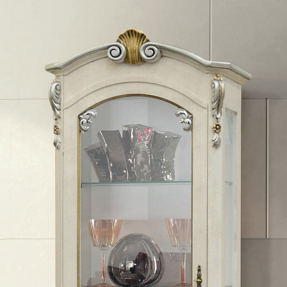 Classic style luxury living room display cabinet made of precious white wood with door and practical drawer, available in the version with door that opens to the right or to the left, adaptable to any furnishing need. Elegant and timeless, this classic style display cabinet is ideal for creating impressive settings. Completely made in Italy and handcrafted by skilled master craftsmen , finished with wisdom and taste for elegance. The production is carried out using fine materials , and performing the work by hand with the utmost care and professionalism that distinguishes Made in Italy products.