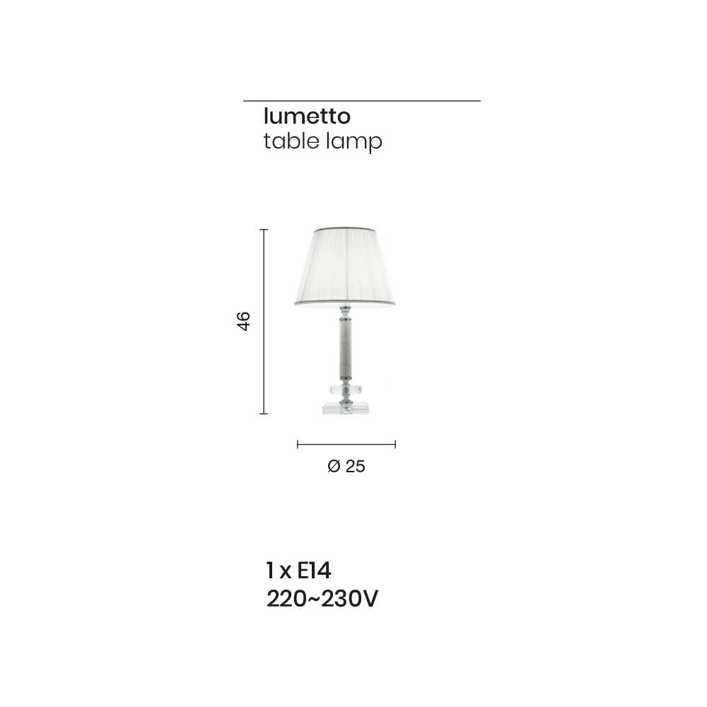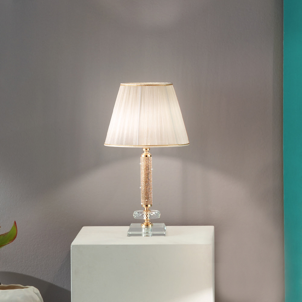 The design concludes with a lampshade in pleated effect fabric which ensures soft and suffused lighting; perfect both for bedroom bedside tables and for the desk of an office or lounge with a classic and elegant style.