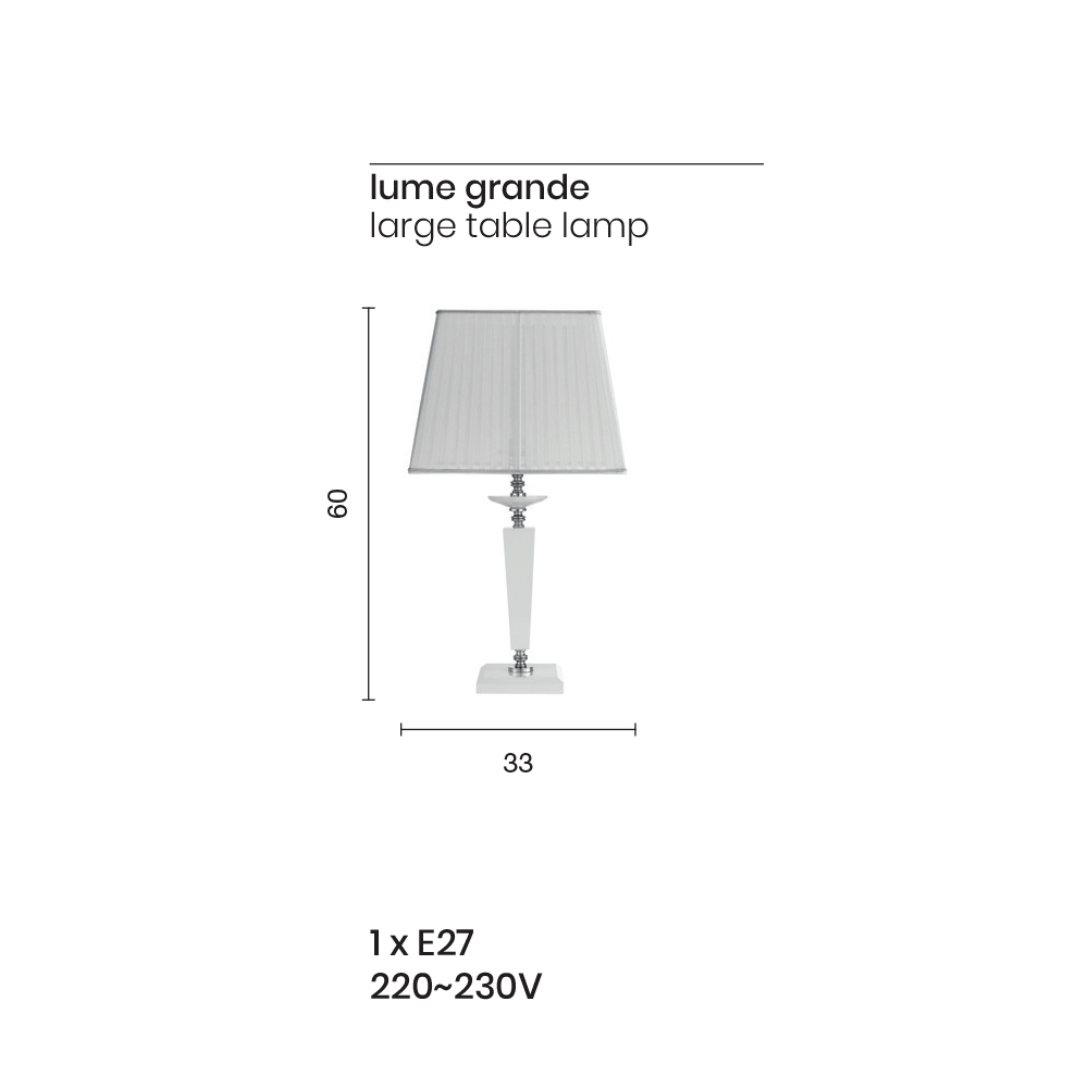 Able to characterise the environment, this table lamp is composed of a white square base , two square-shaped elements in hand-crafted white glass and a white fabric lampshade with a pleated effect.