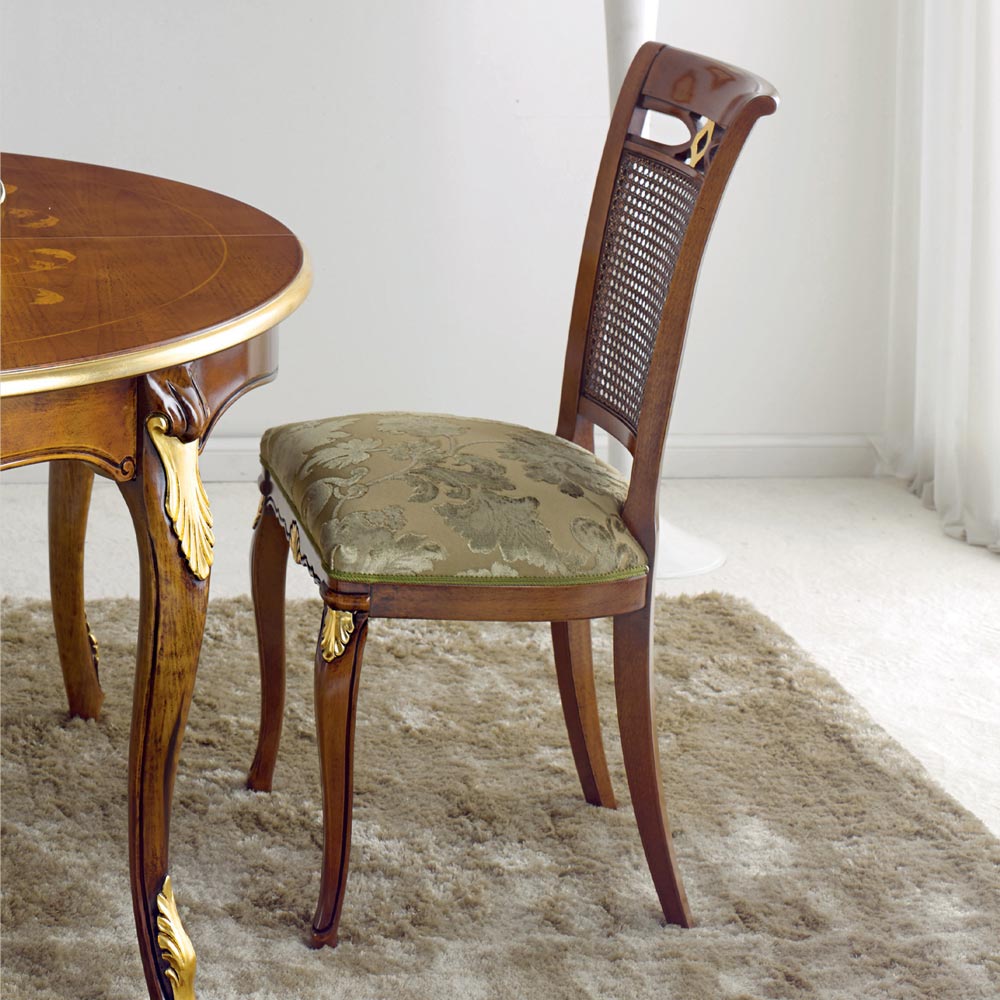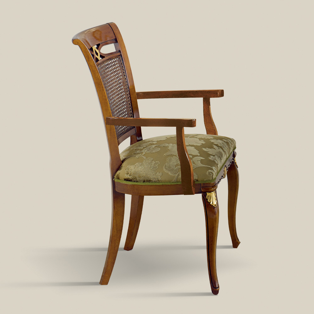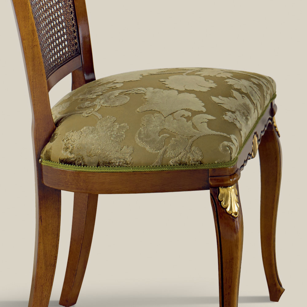Dining room chair with a timeless classic style , perfect for decorating any living area with personality and elegance . This chair has a structure made of wood with Bassano walnut and antique gold finish and a seat with a padded seat covered in fabric with a backrest made of Vienna straw . It is also possible to choose between the version with or without armrests.