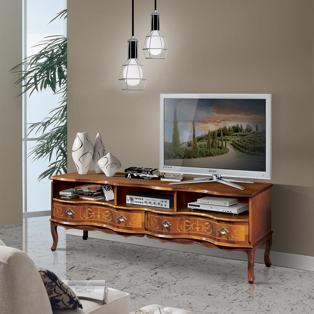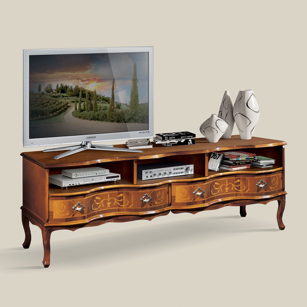 Classic-style wooden TV stand with compartments and drawers, Made in Italy.