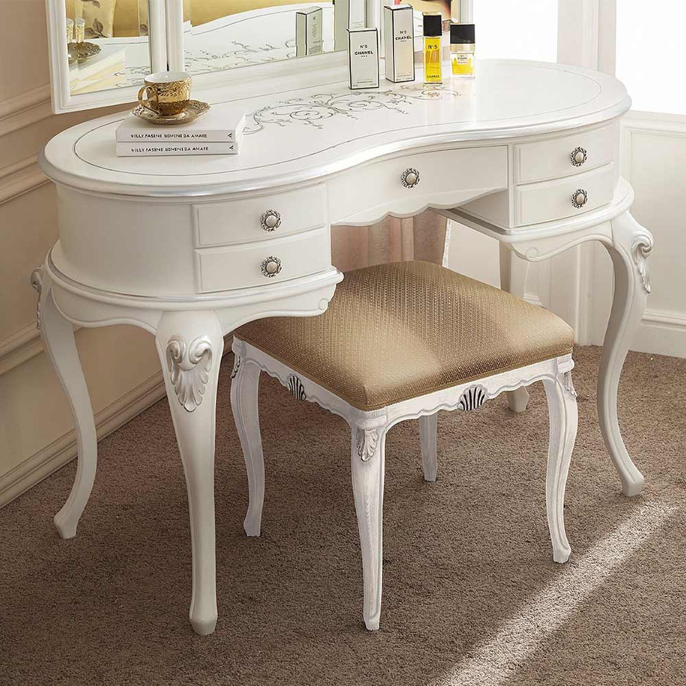 Classic style make -up comb with 5 drawers and shaped mirror. Made of wood and available in Bassano walnut and antique gold finish with inlays or white wood and silver details. A unique and refined complement, completely