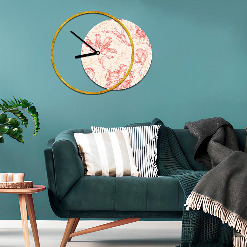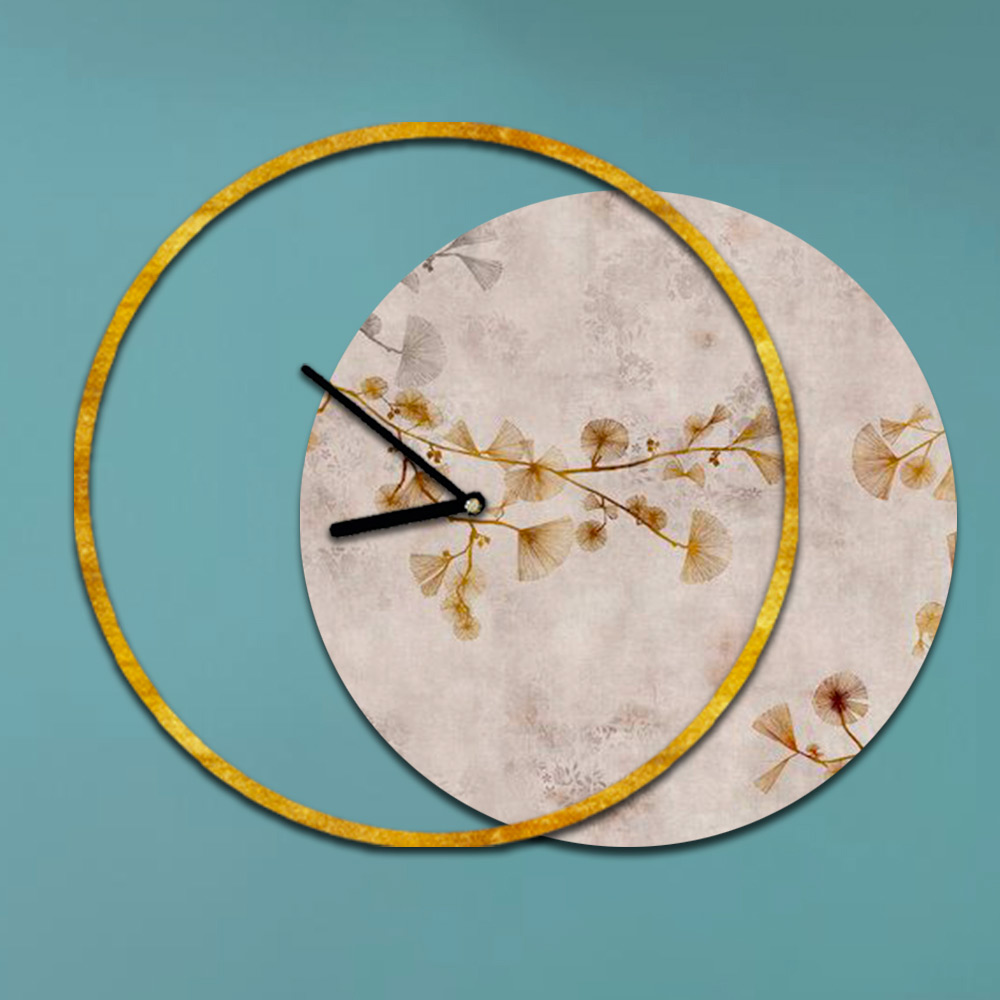 • gold leaf clock and print with branches and flowers in shades of pink/ochre