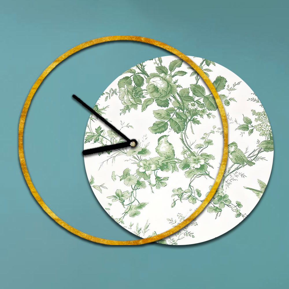 • gold leaf clock and print with branches and birds in shades of green