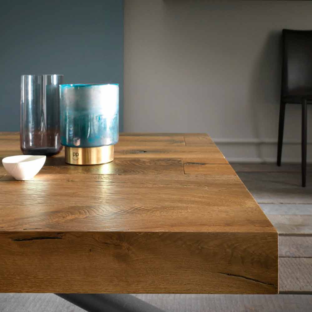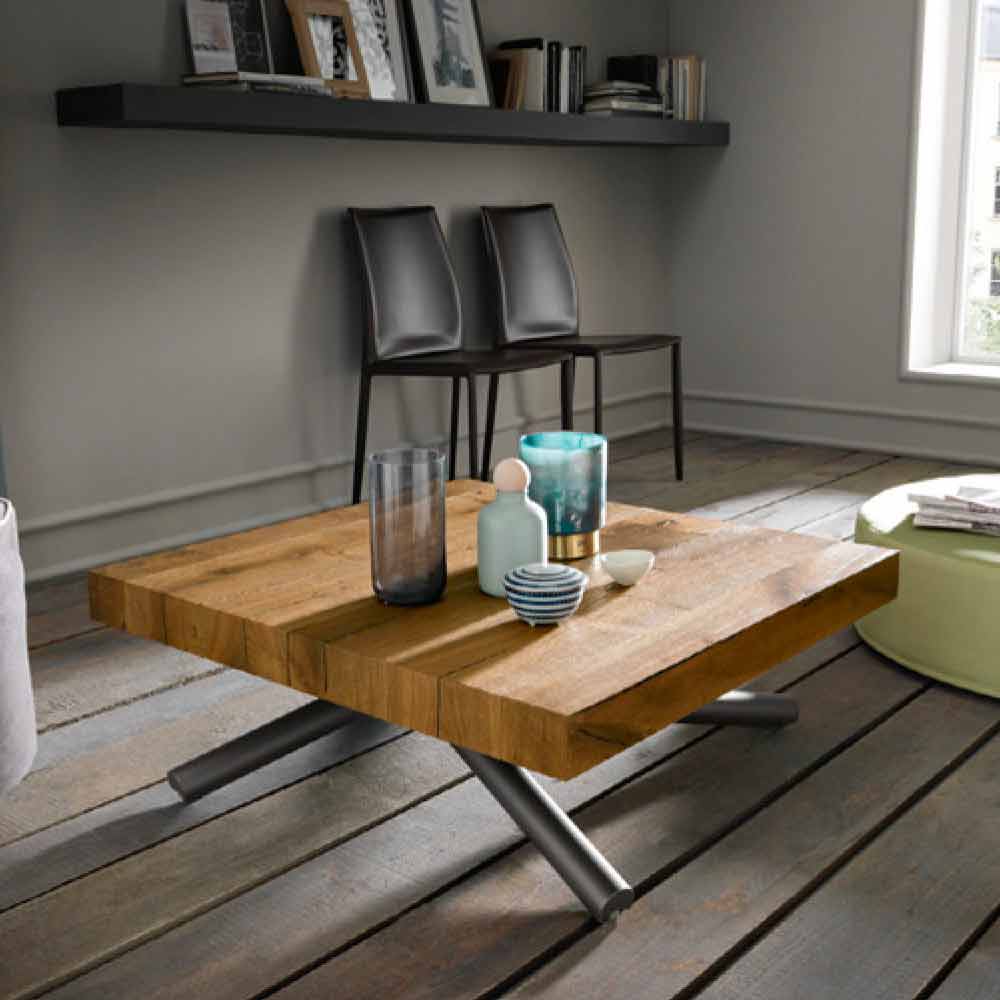 transformable coffee table combines the modernity of the concept and the interwoven design of the metal legs with the more naturalistic and valuable part of the thick (8 cm) solid oak top.