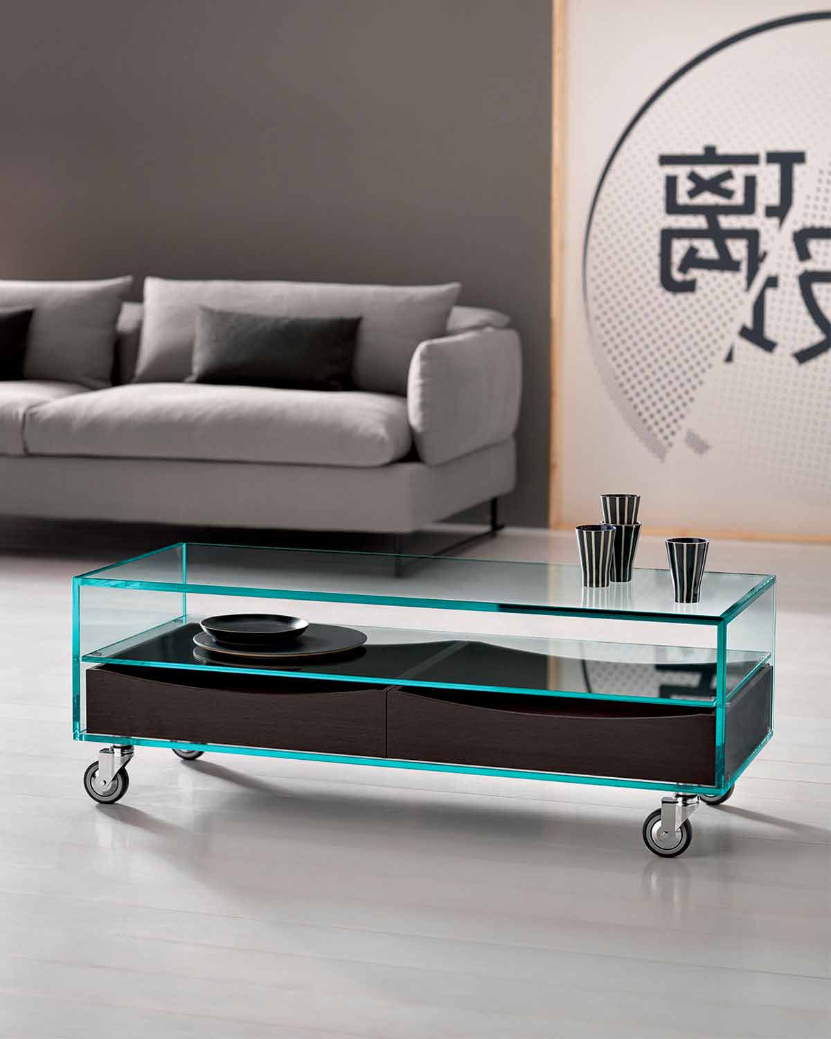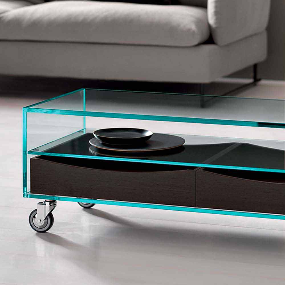 Modern style lounge coffee table on wheels in extraclear glass with two wengè wood drawers, Made in Italy.