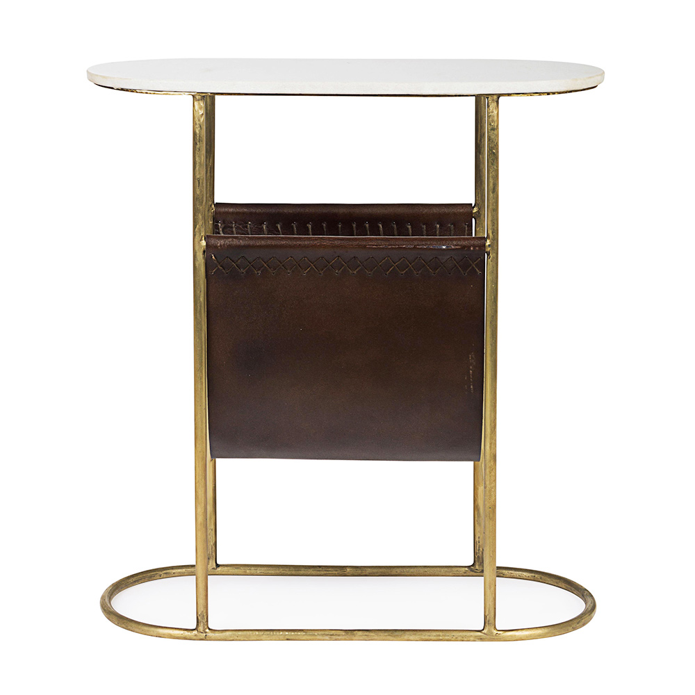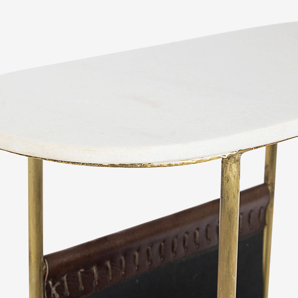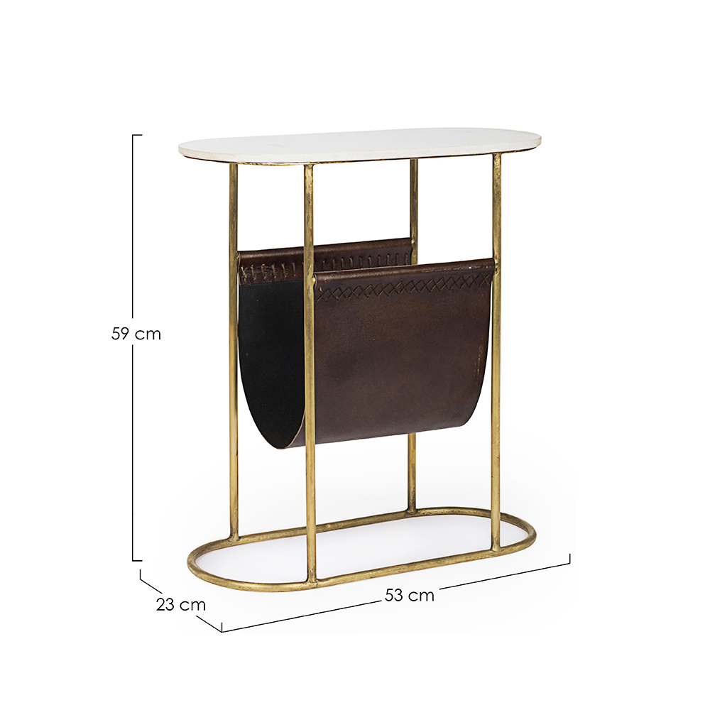 Coffee table in brass-plated steel and marble top with leather magazine rack.