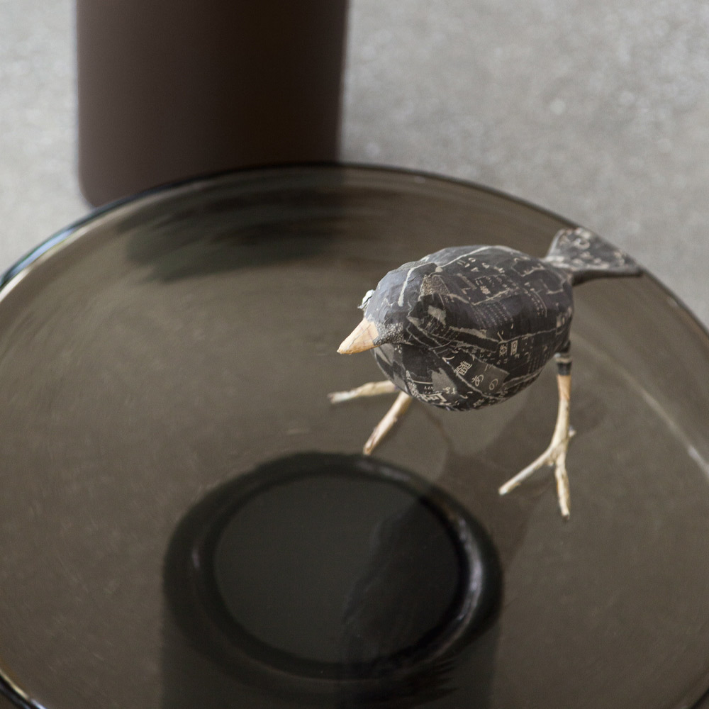 - Top in transparent smoked balloton glass, embossed graphite base