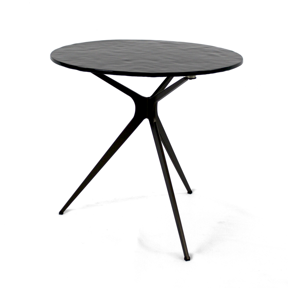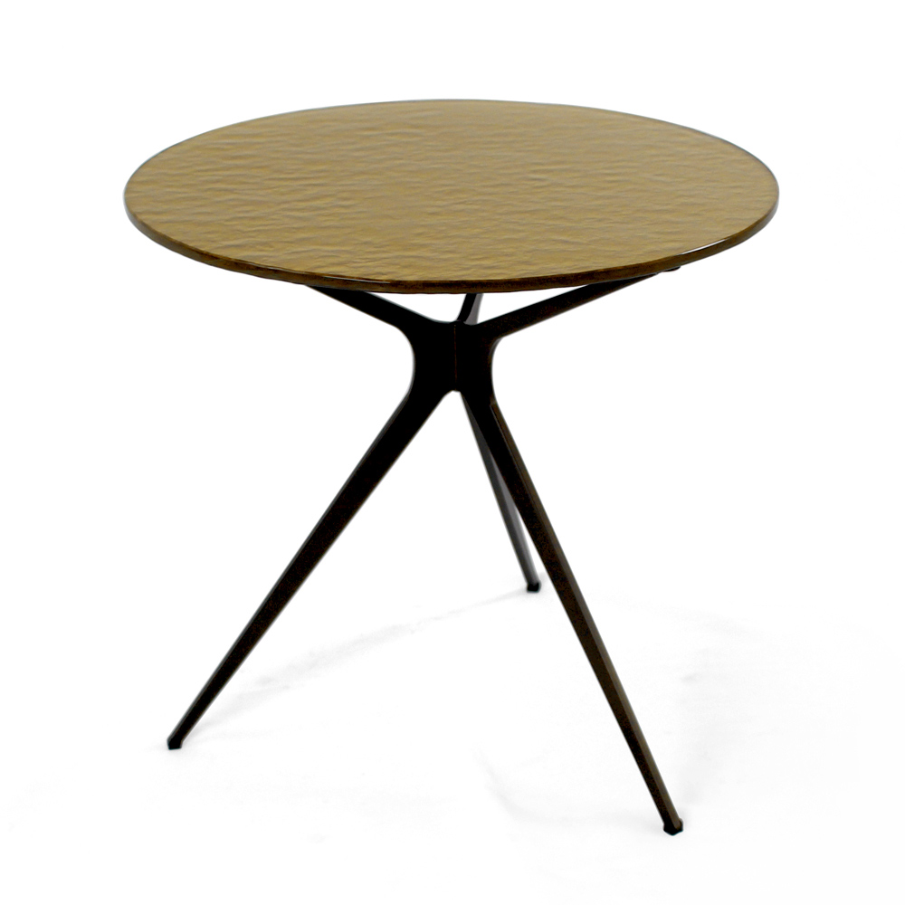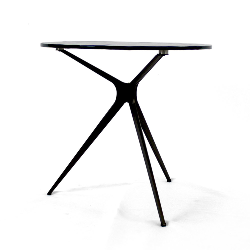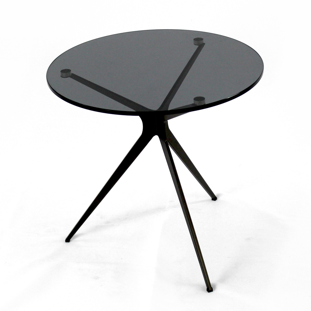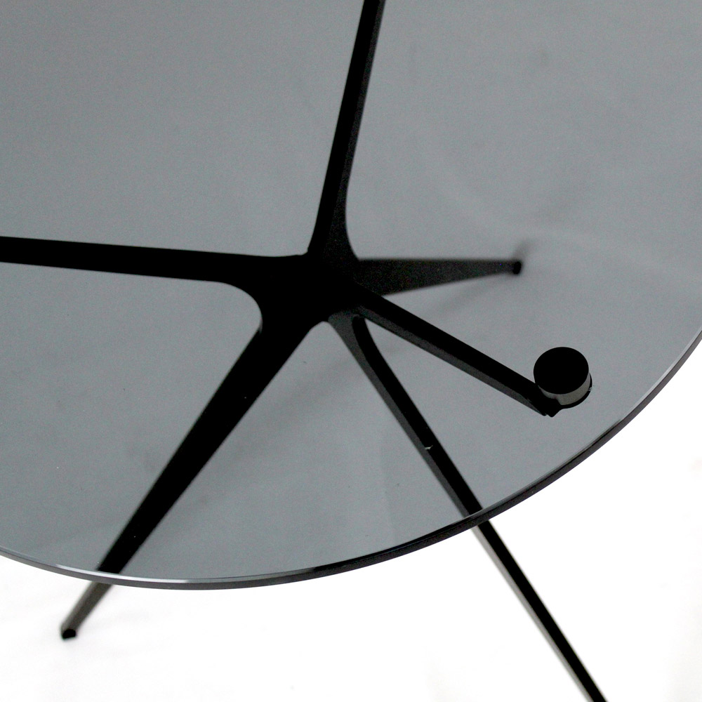 Round coffee table with painted steel base and glass top.