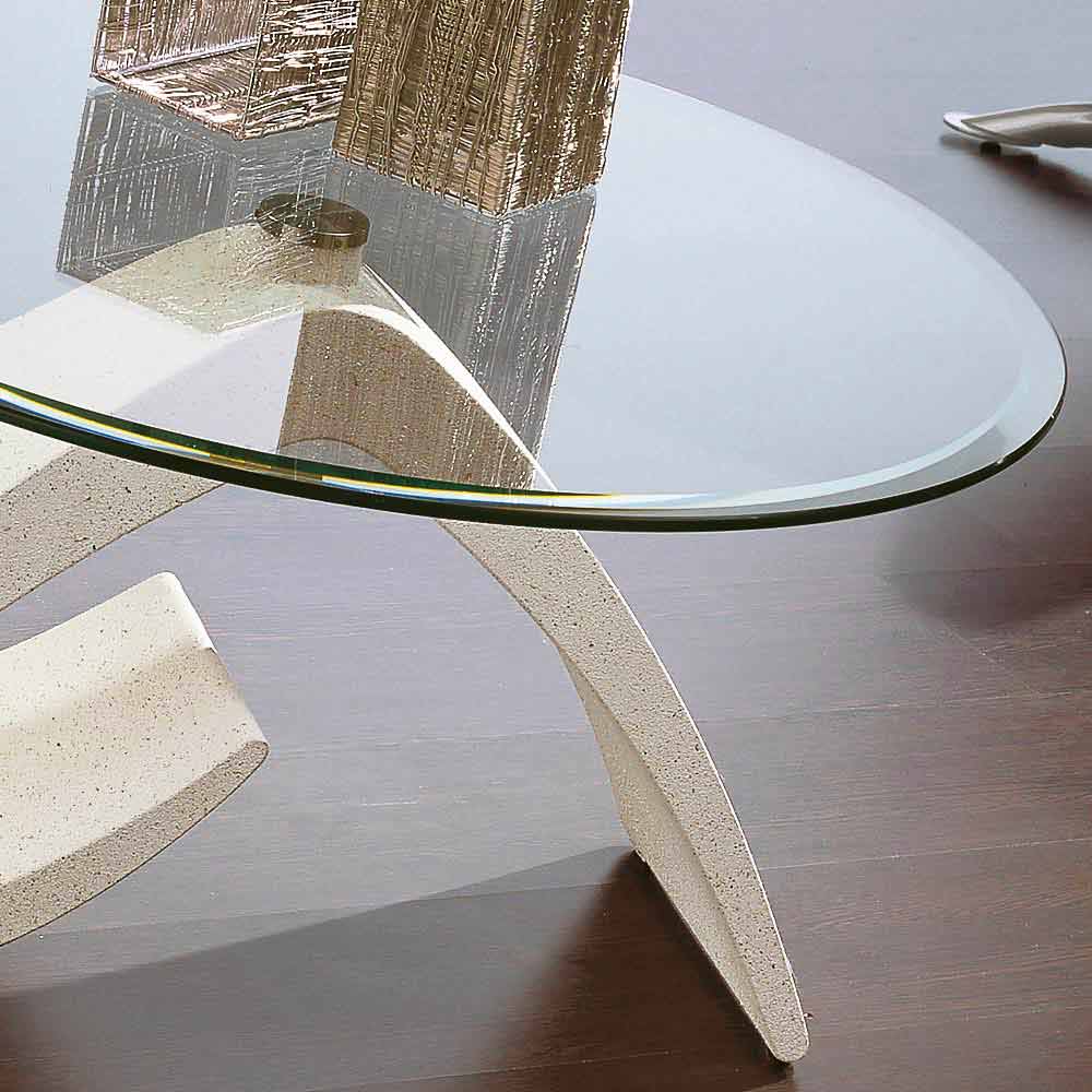 Coffee table made in Italy with round top in bevelled transparent glass and base in mineral marble , a material obtained by mixing marble powders. An exclusive and elegant design characterises this piece of furniture with a strong refined personality , ideal for furnishing any domestic living space with character, bringing with it an avant-garde touch . Thanks to the use of high quality raw materials and the 100% Made in Italy workmanship, a precious and valuable coffee table is born that stands out for its elegance and creativity in the shapes. The base in mineral marble offers the coffee table excellent solidity and robustness as well as giving the aesthetics its strong modern style. Its particular figure characterized by simple geometric queues creates a wonderful harmony with the soft shape of the glass top, giving the product design an exclusive aesthetic sense.