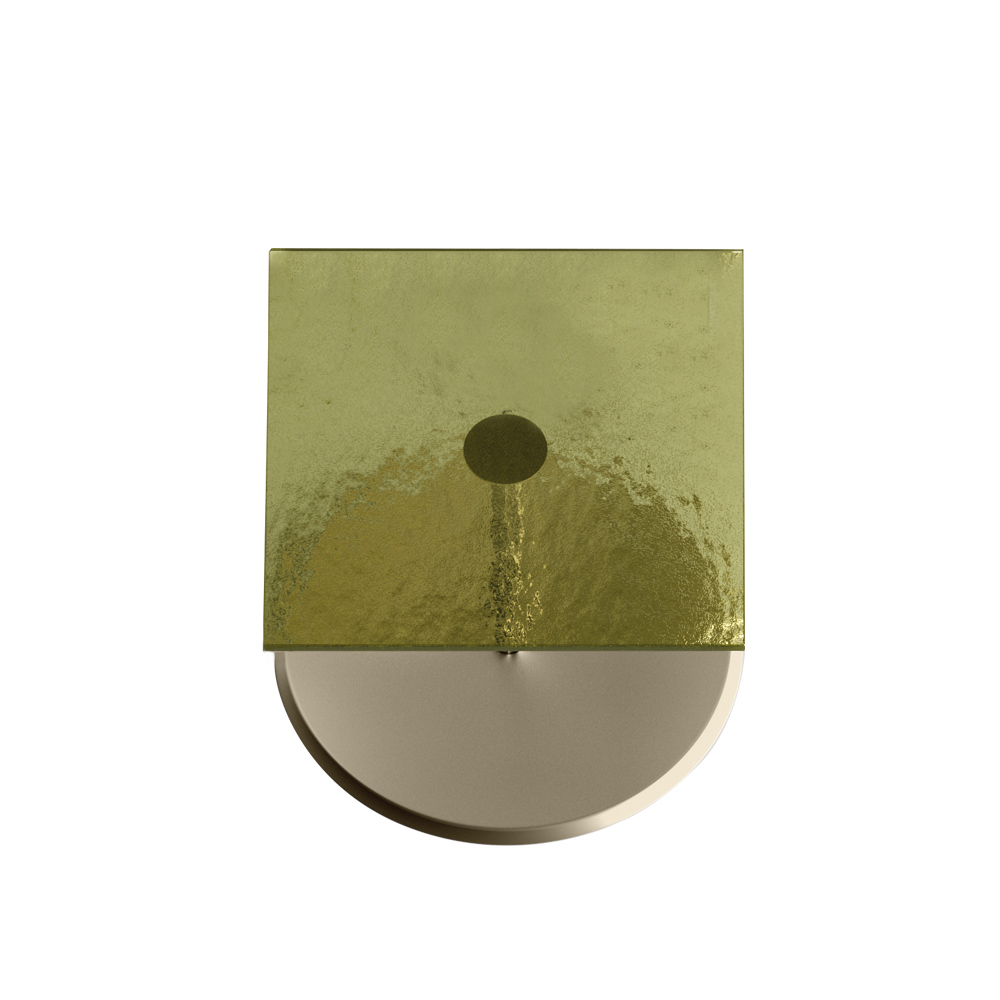 - champagne metal top and olive green fused glass base