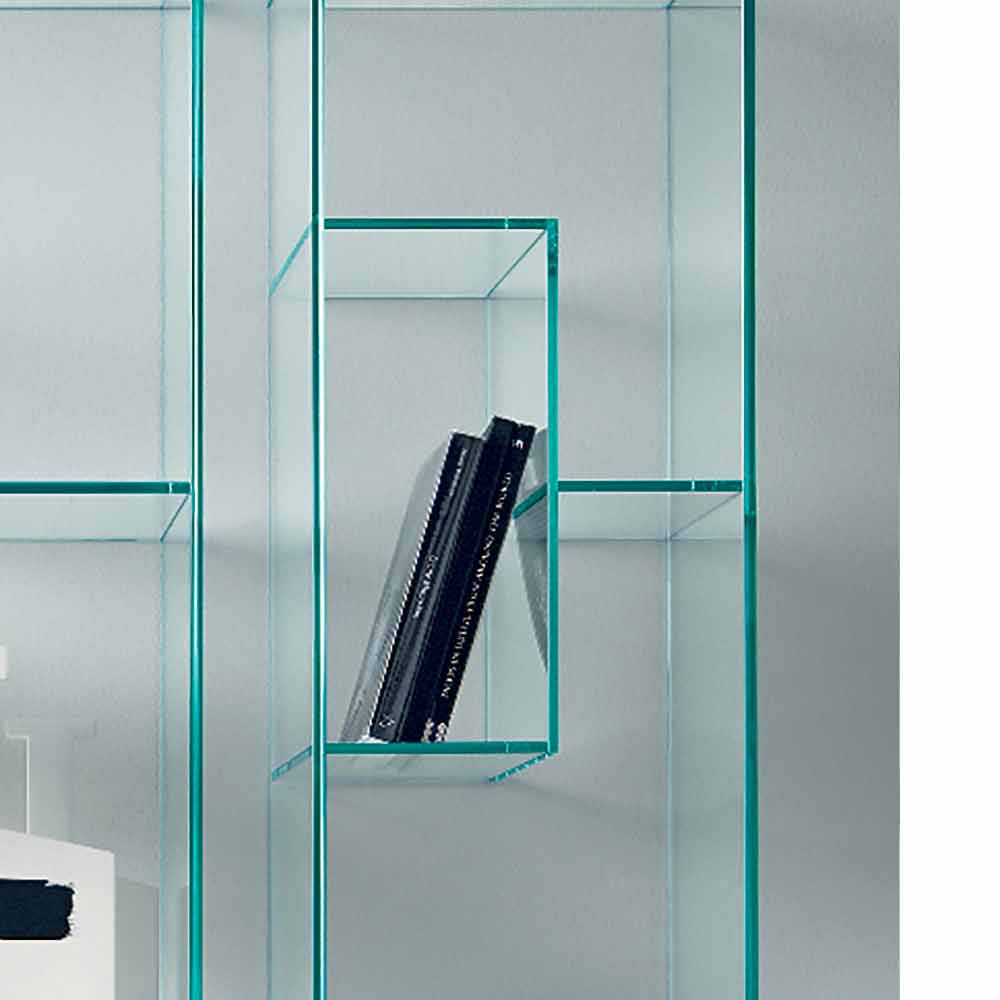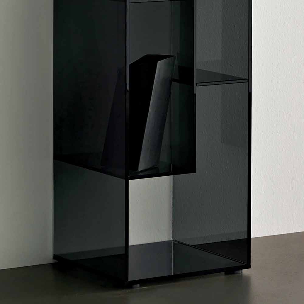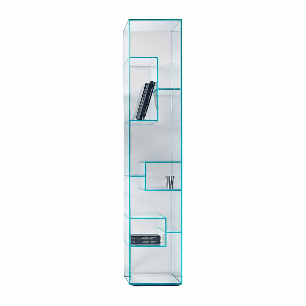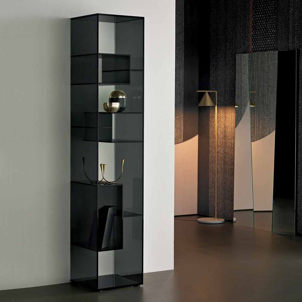This display bookcase is characterized by its determined and elegant design entirely made of extra-clear or smoked glass.