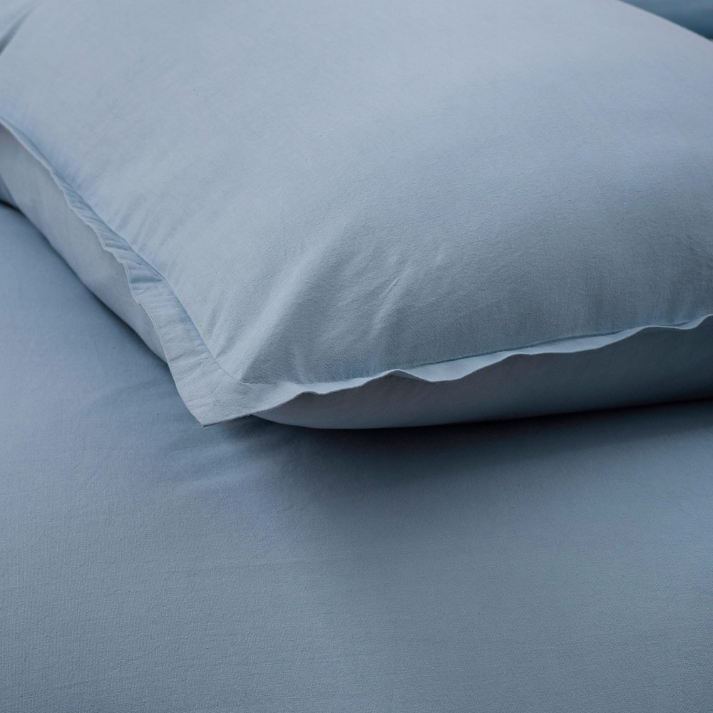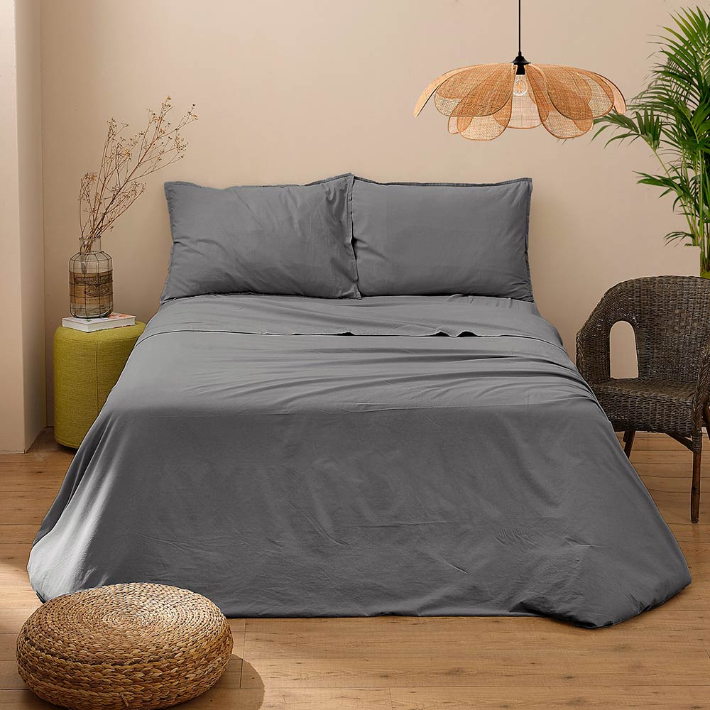 garment-dyed pure cotton double bed set . The soft and breathable texture of the cotton ensures unparalleled comfort, while the garment-dyeing technique gives a rich and long-lasting colour that lasts wash after wash. Perfect for those who want to combine style and functionality, this set includes top and bottom sheets and coordinating pillowcases, all designed to offer you maximum comfort and add a touch of sophistication to your room.