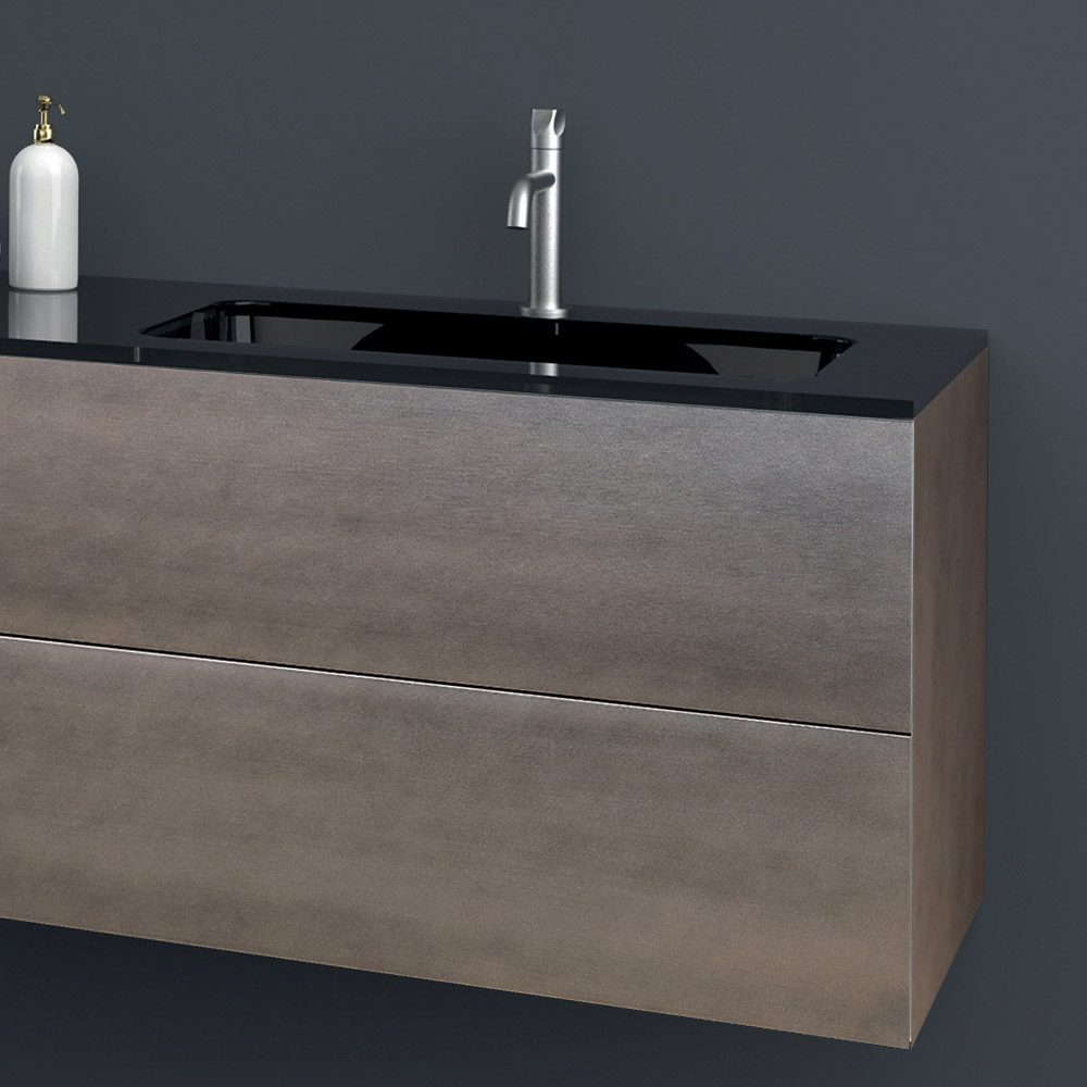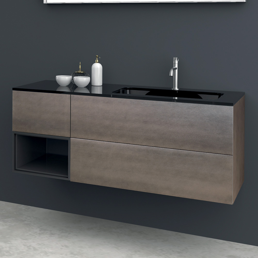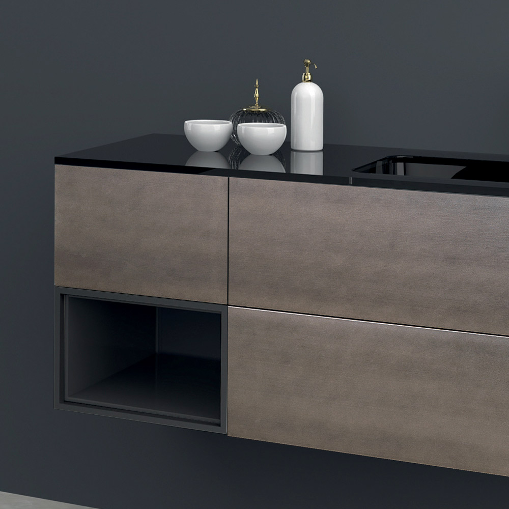 washbasin base with 2 drawers and an open side shelf with a drawer above and an elegant and refined