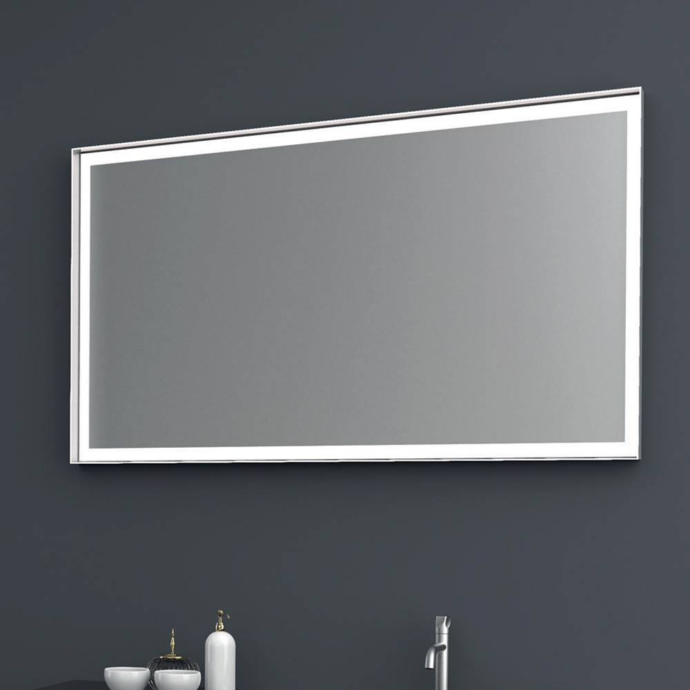sandblasted mirror with LED lighting on the 4 sides combined with an antique platinum painted metal frame.