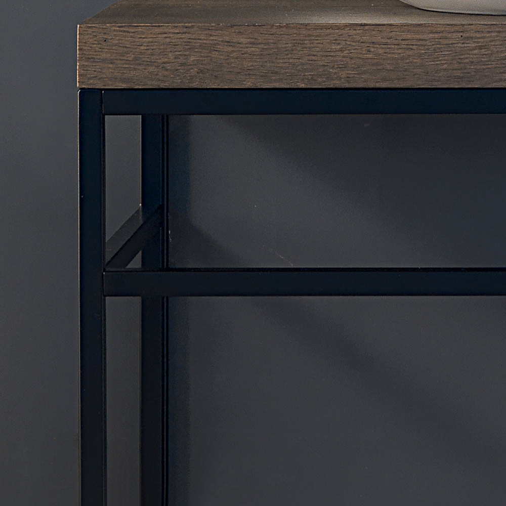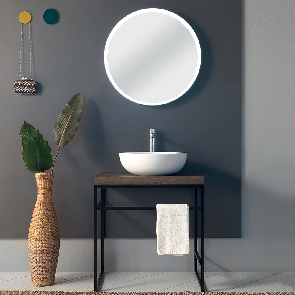 an industrial style. This elegant composition includes an open washbasin base with towel holder and mirror.