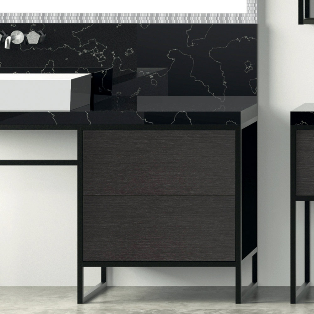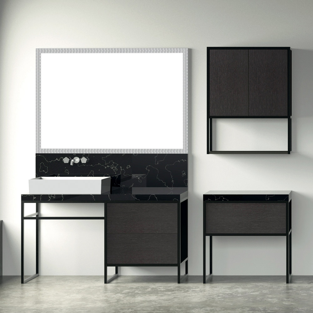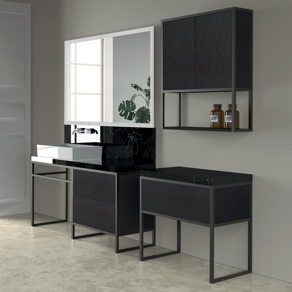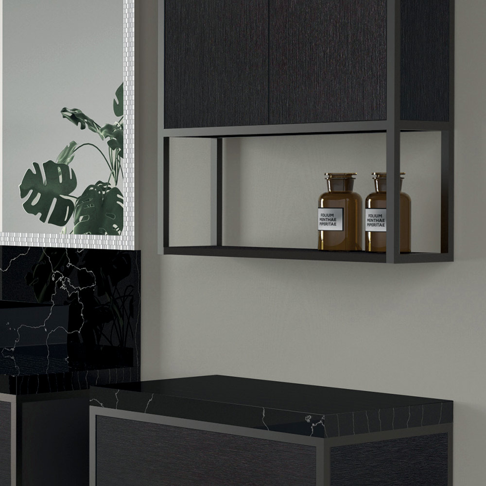 bathroom furniture is characterized by a structure made with a thin matt black painted metal profile that frames the black metal eco-wood doors, creating a harmonious combination of full and empty spaces. The metal finishes of the doors highlight the