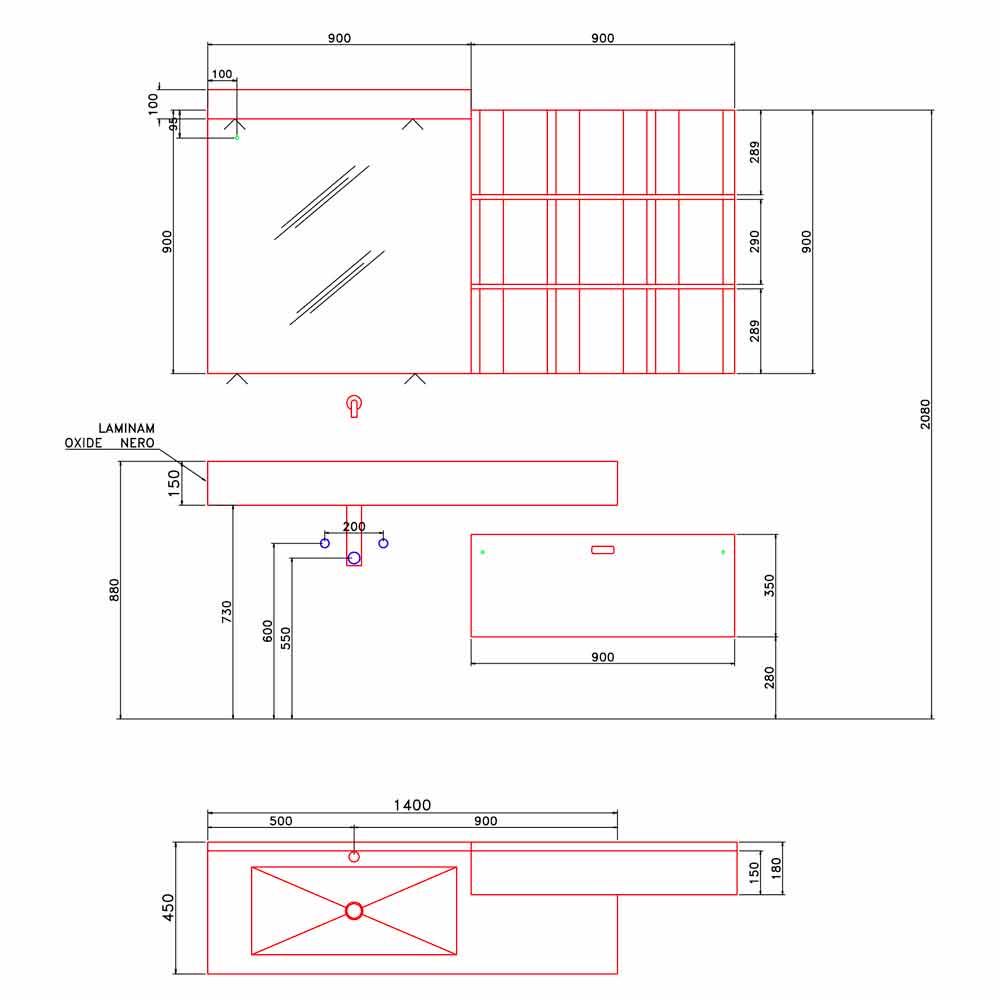 The composition is in heat-treated oak, wall-hung washbasin in black laminam oxide.
