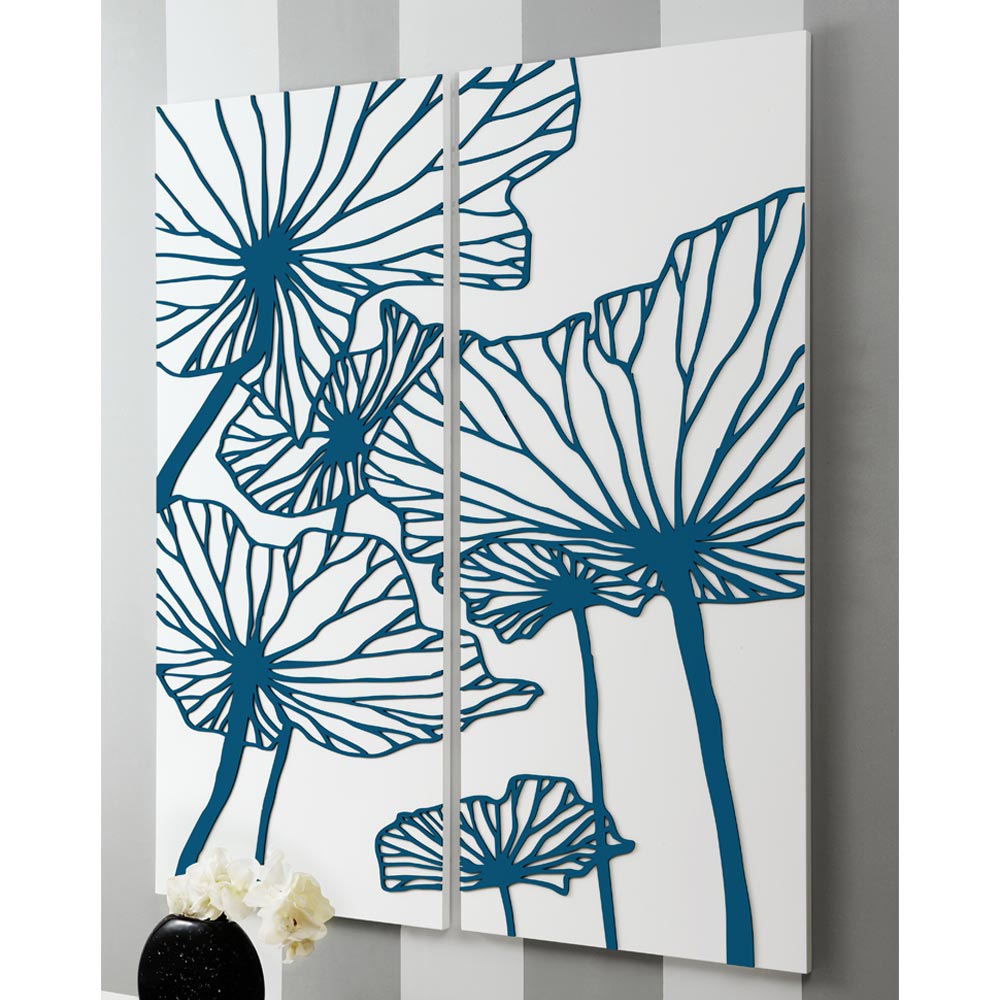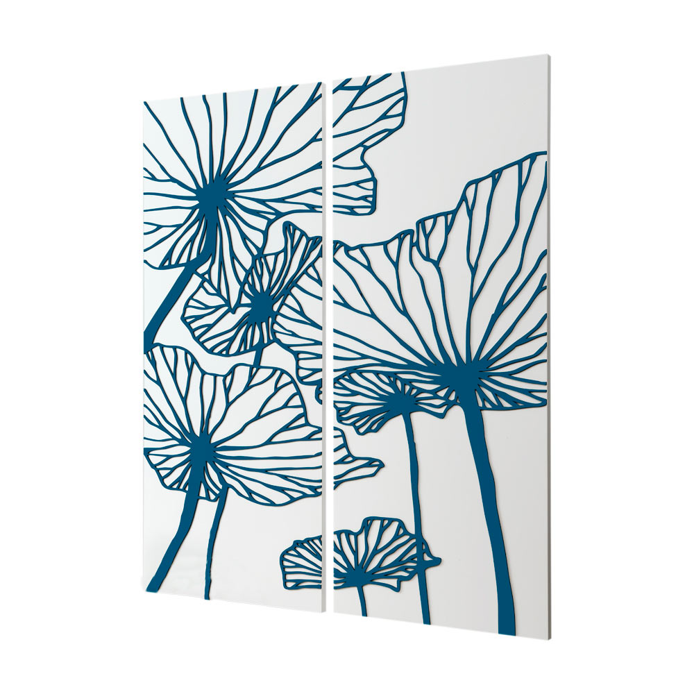 Composition of two panels in matt white lacquered wood with the application of petrol-colored wooden decorations depicting giant flowers.
