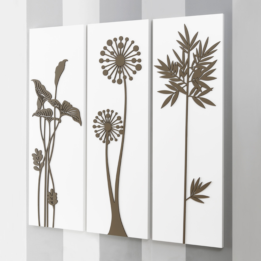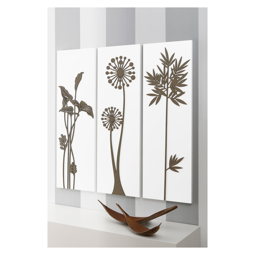 The composition of panels is made using the laser marking technique which creates a bas-relief on the material, creating different gradations of colour created on the panel. The panel is made of white lacquered wood with dove gray decoration. It represents stylized flowers and leaves, which create an essential trio of panels.