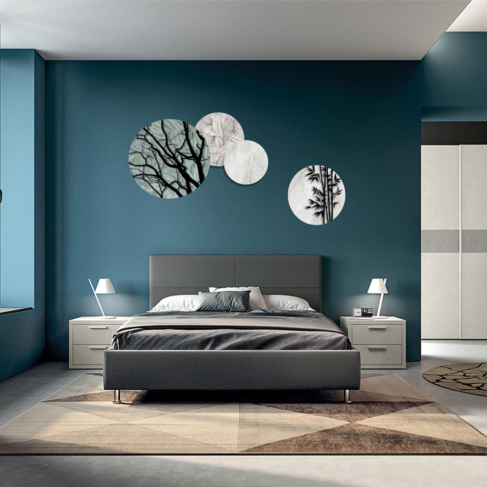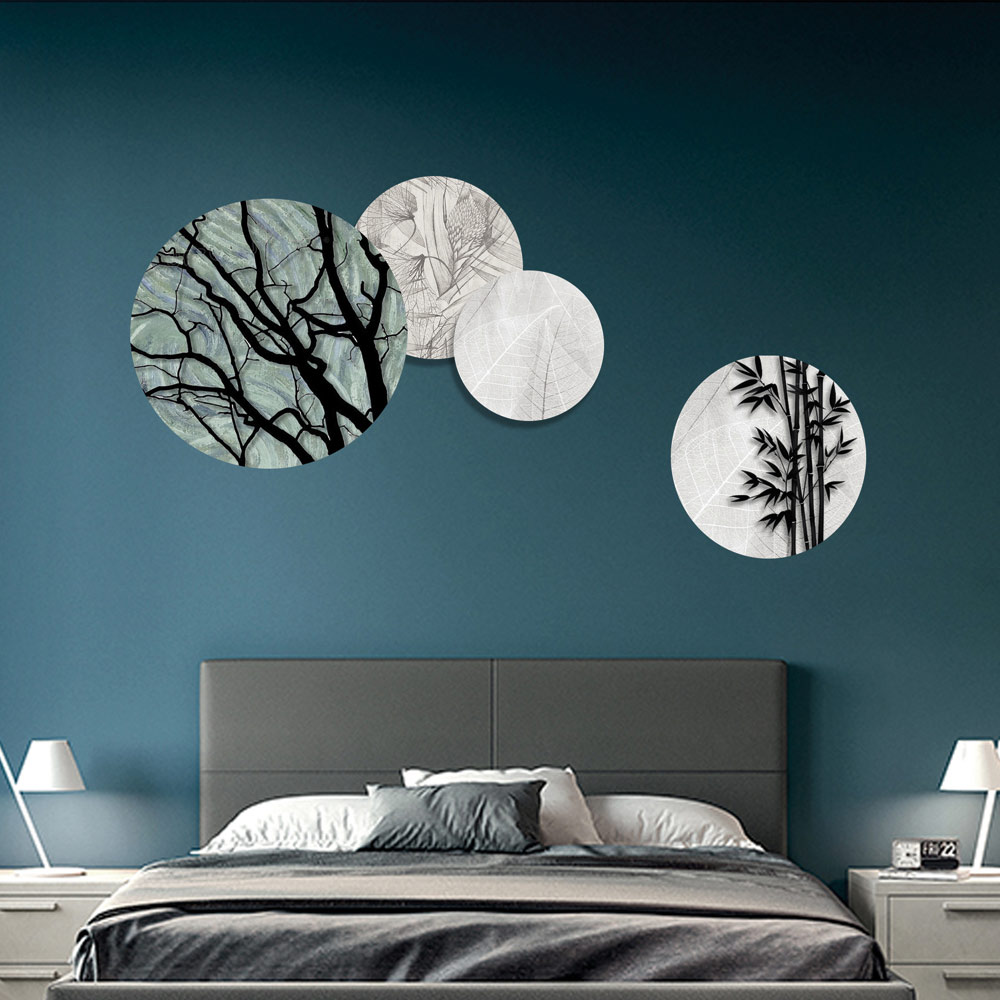 Composition of four panels of different sizes that combine laser and print decorations . Composed of four circular panels in printed wood : one depicts black branches on a green / blue / grey background, one of leaves in shades of brown and sand background, one with white leaves and grey background and the other with white leaves and black branches .