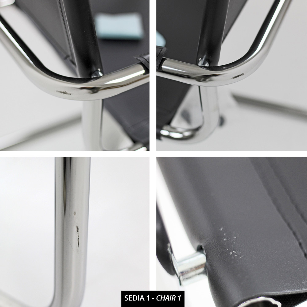 Modern meeting room or conference room chair in chromed metal and black bonded leather.