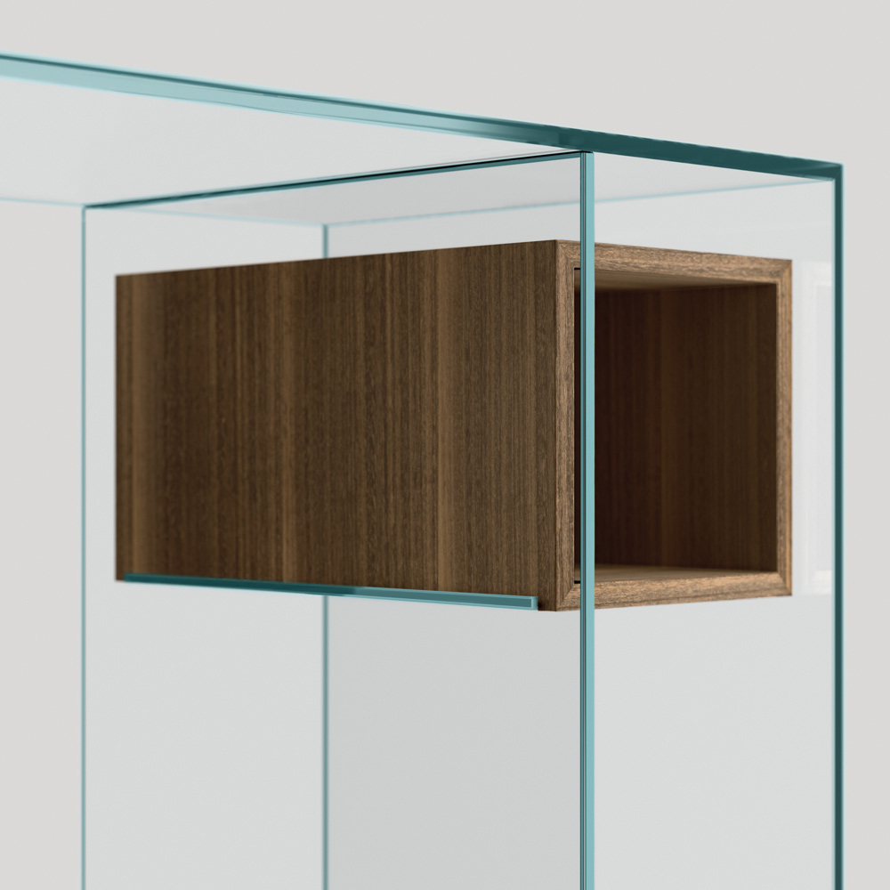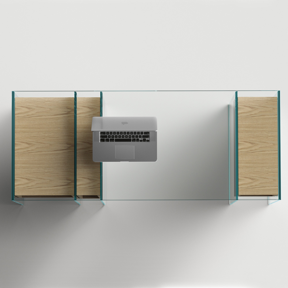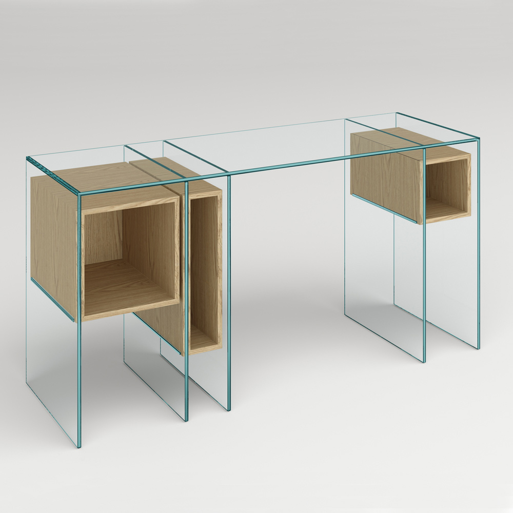 Desk console in extra-clear glass with wooden details Made in Italy.