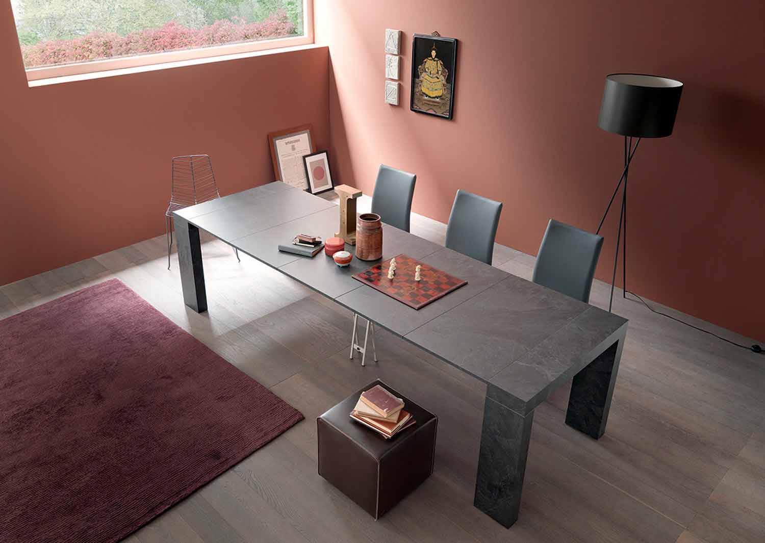 extendable console is outlined by an important and monumental design that becomes the protagonist of the room in a scenic and functional way.
