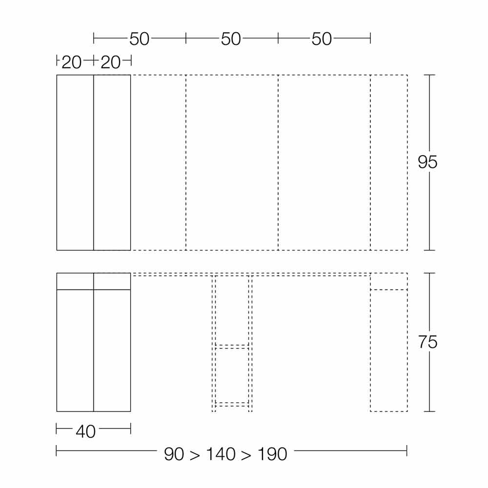 - Console: L 95 x D 40 x H 75 cm; Table W 90/140/190/240/290 x D 95 x H 75 cm