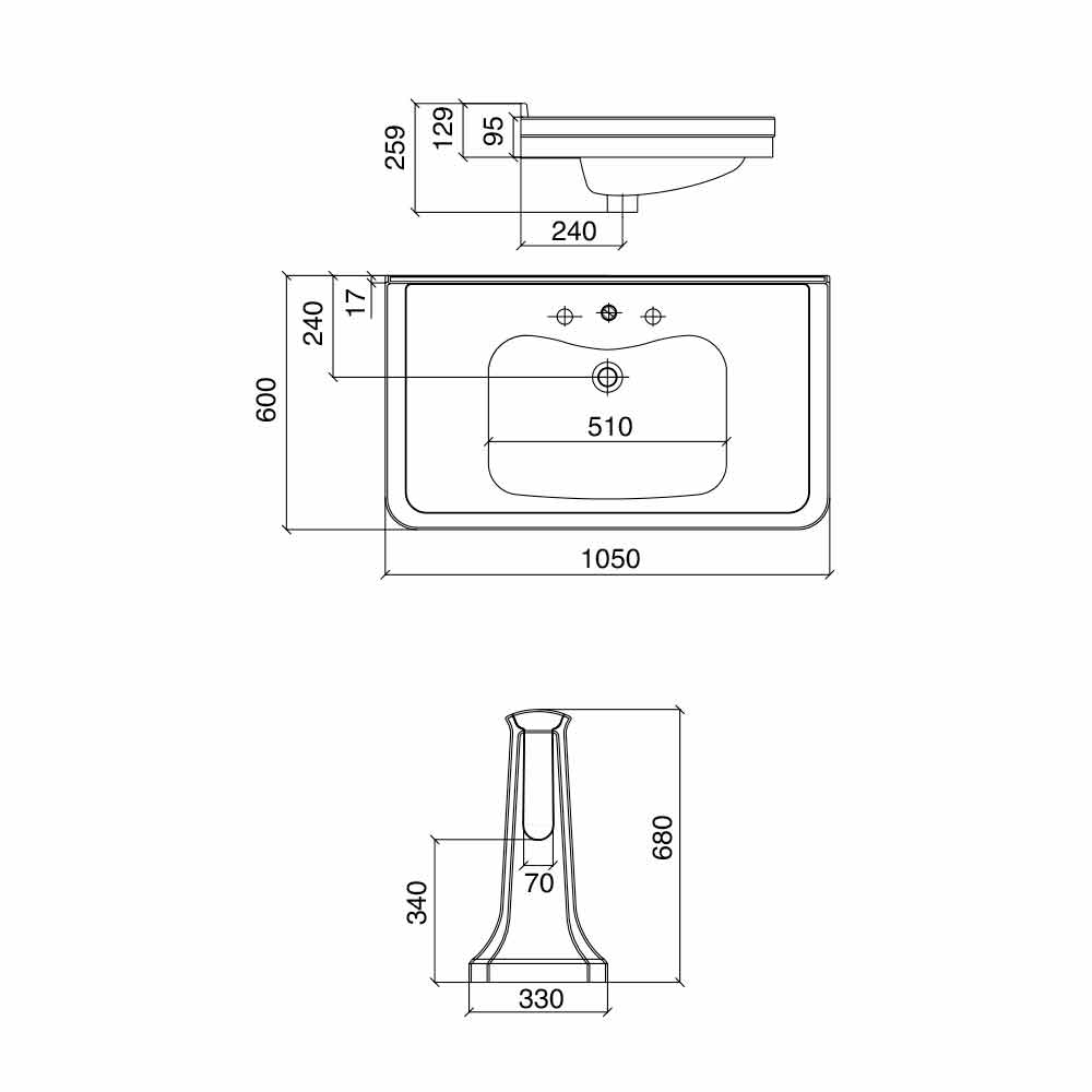 - L 105 x D 60 x H 58 cm with upstand 1-3 tap holes - L 10550 mm;