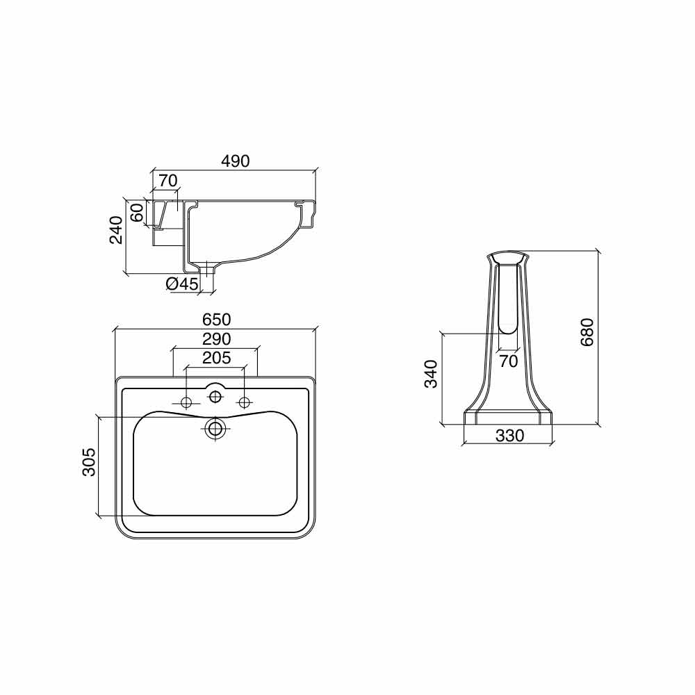 - L 69 x D 53.5 x H 57.5 cm with edge spray board 1-3 tap holes - L 690 mm;