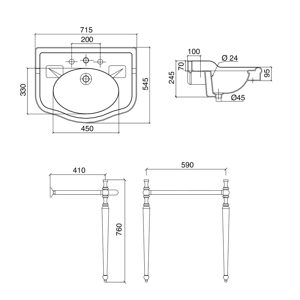 - top: L 71.5 x D 54.5 x H 24.5 cm base: L 59 x D 41 x H 76 cm, with single washbasin backsplash and splash guard edge 1 or 3 tap holes - L 715 mm;