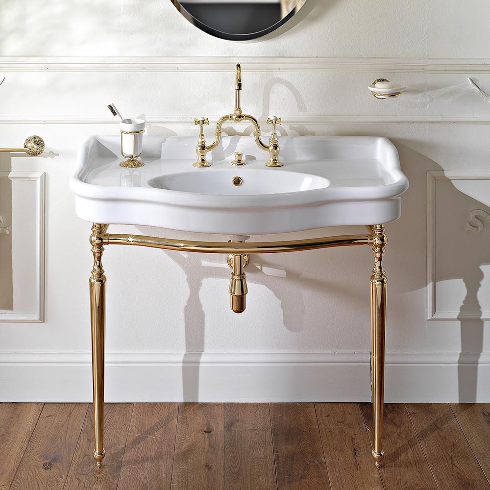 Vintage bathroom console with double bowl in white ceramic and Paulina metal, made in Italy.