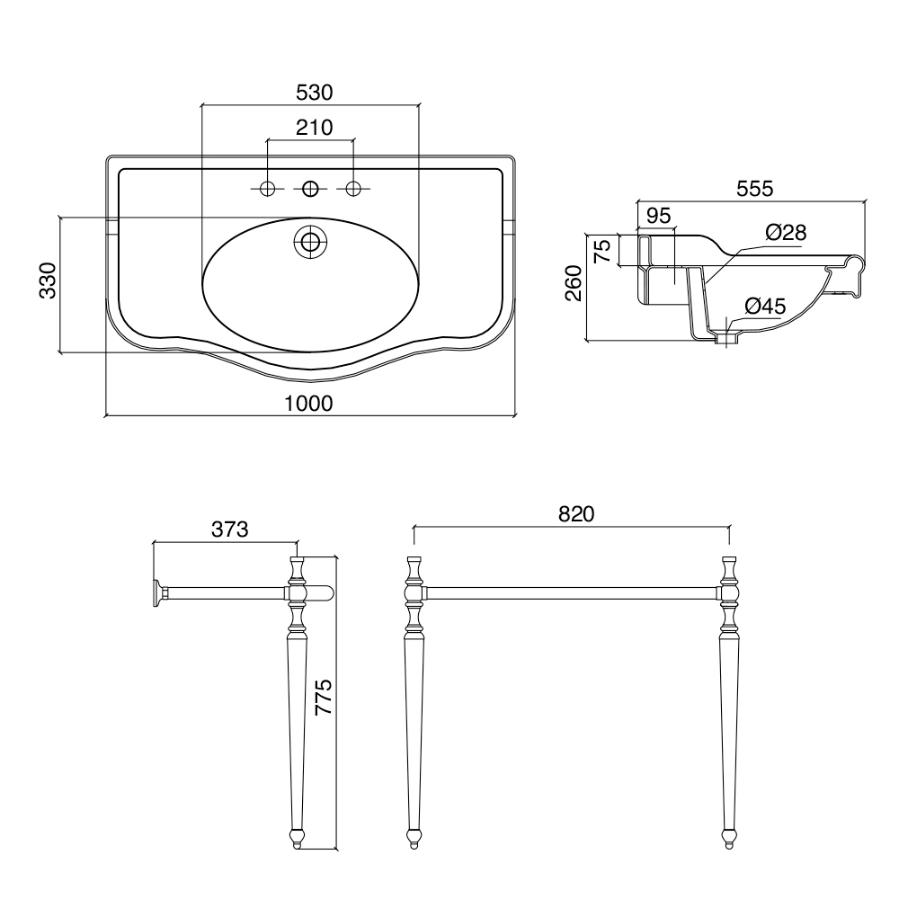 - top W 100 x D55.5 x H 26 cm, base W 82 x D 37 x H 77.5 cm, with single washbasin with backsplash and splash guard 1 or 3 tap holes - L 1000 mm;