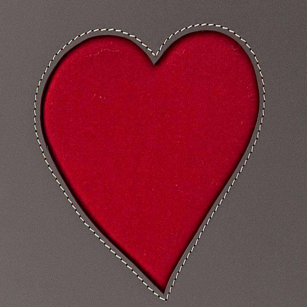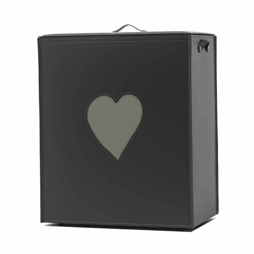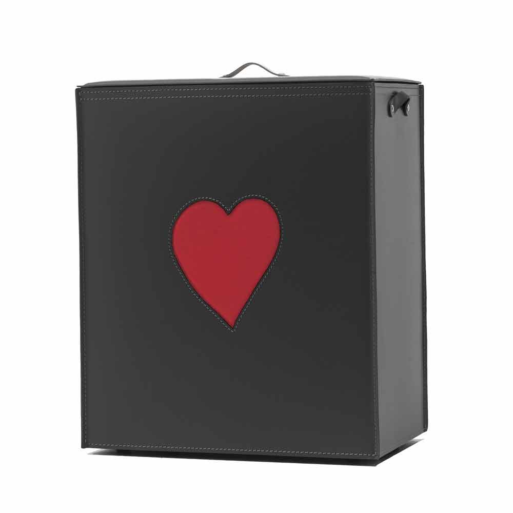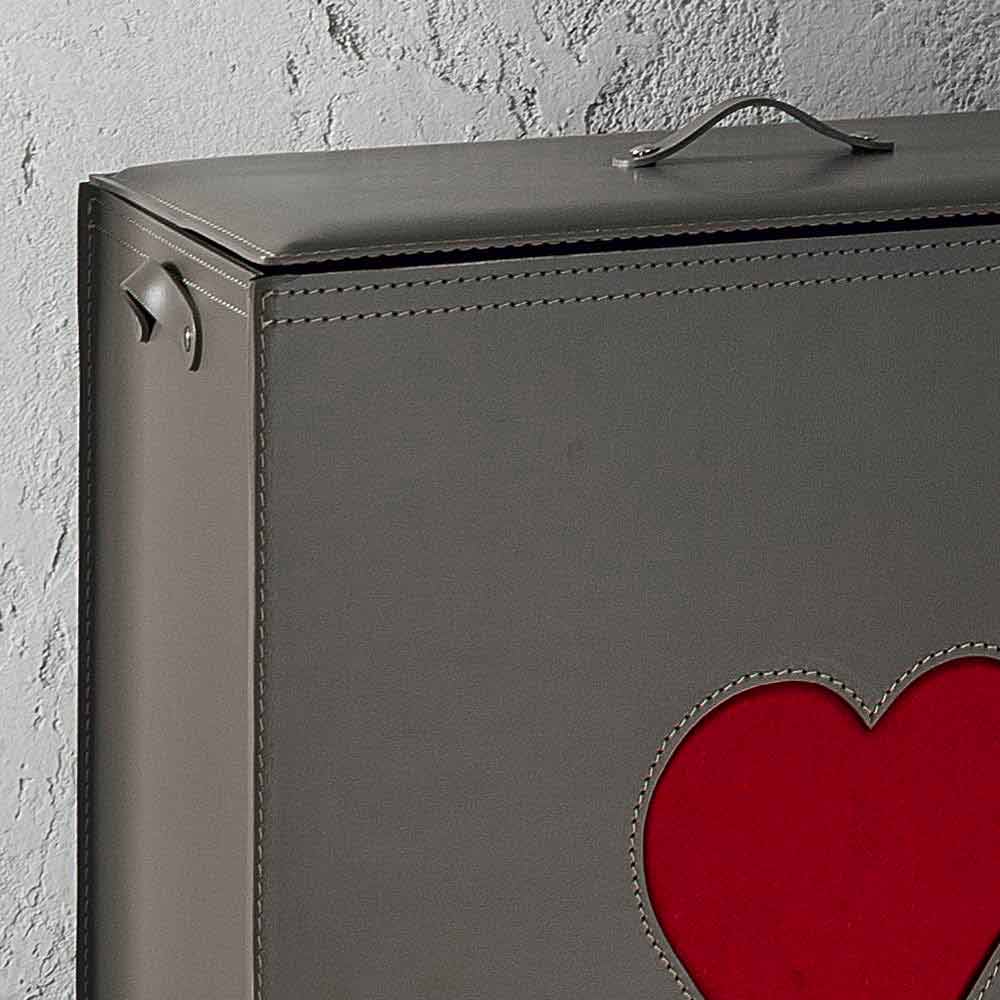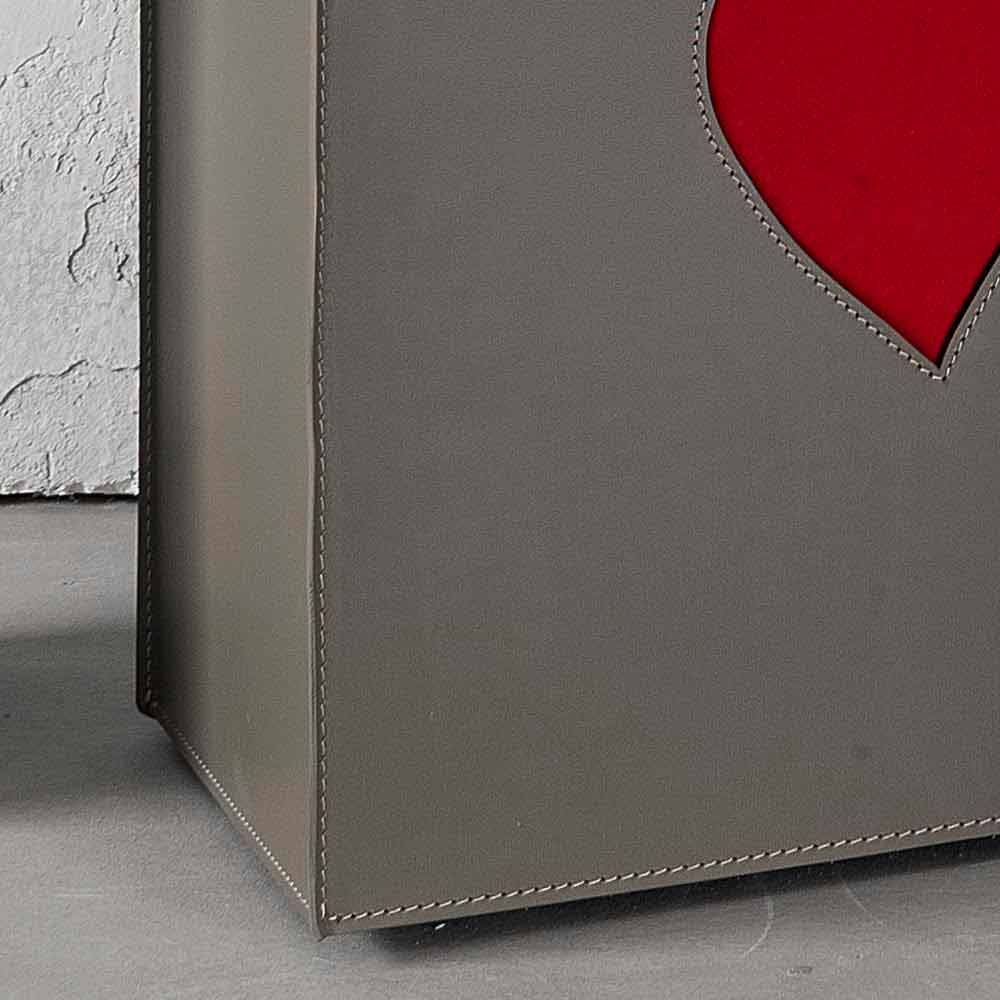 Rectangular laundry basket made of regenerated leather both inside and outside, with a heart-shaped decoration in a choice of red or dove grey. The bottom is made of plywood, also covered in leather. Equipped with practical rubber feet. Inside there is a removable cotton bag.