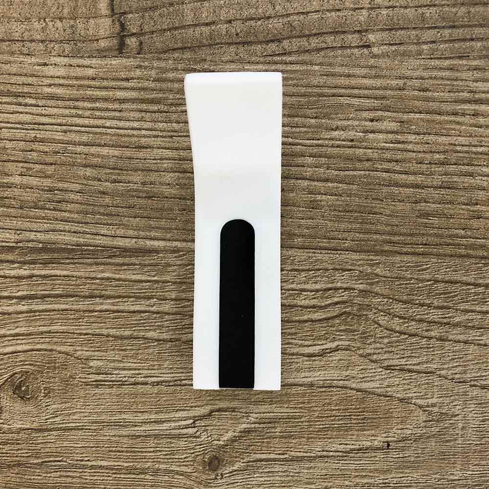 wall hangers are made of 6 mm thick white corian solid surface with a white or black band insert.