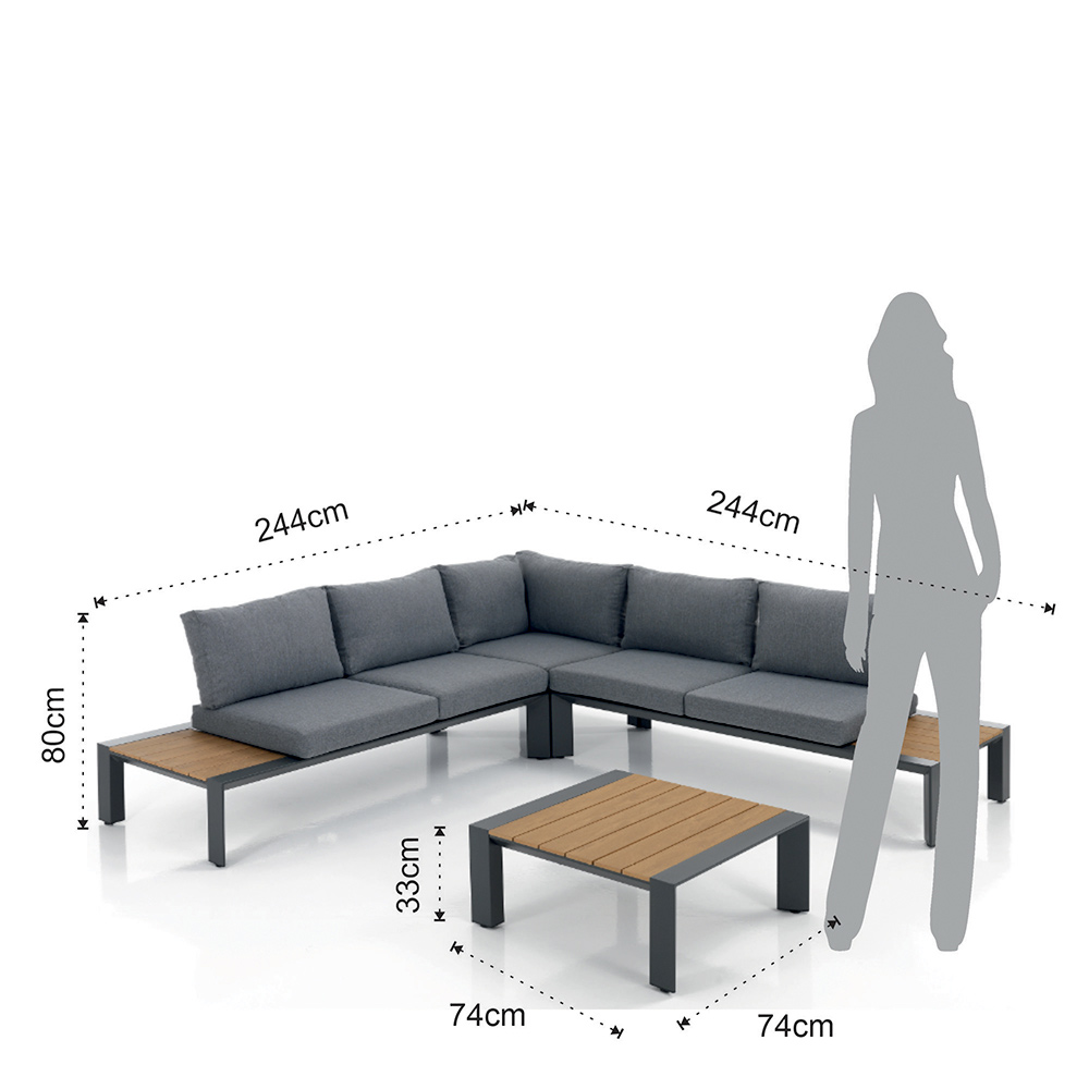This corner sofa and garden table represents the quintessence of elegant relaxation and contemporary style. With its structure and clean queues, the sofa offers a chic and modern contrast against the warm wood of the seats and table surface, creating a welcoming environment that is both inviting and aesthetically pleasing .