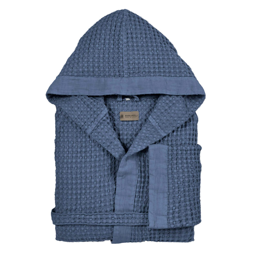 Hooded gown in cotton honeycomb with linen flounce, all garment-dyed. The creased and worn feel of the fabric is the essence of the garment-dyed technique and the chromatic shades obtained are unrepeatable: the same dye bath can in fact create slightly different nuances making your garment unique and exclusive. This item is made and packaged in Italy according to the Tuscan artisan textile tradition.
