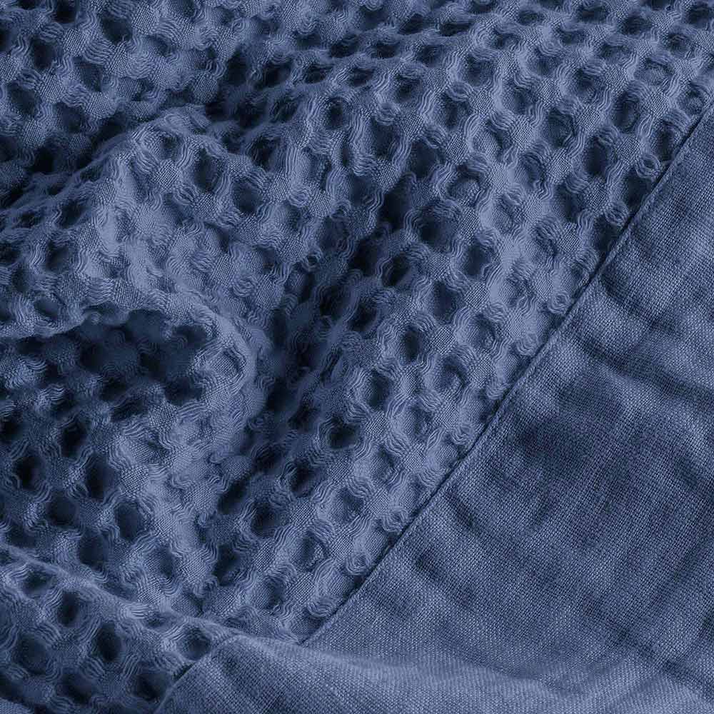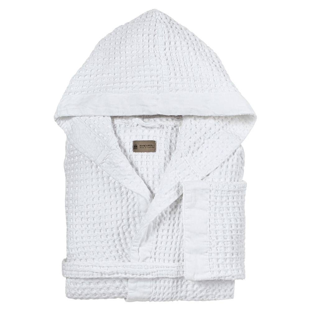 Experience everyday luxury with our hooded bathrobe crafted from cotton waffle fabric, known for its lightweight feel and ability to quickly absorb moisture, providing superior comfort and quick drying. The fabric is cleverly accented with a linen ruffle , adding a touch of artisanal style and a pleasingly contrasting texture.