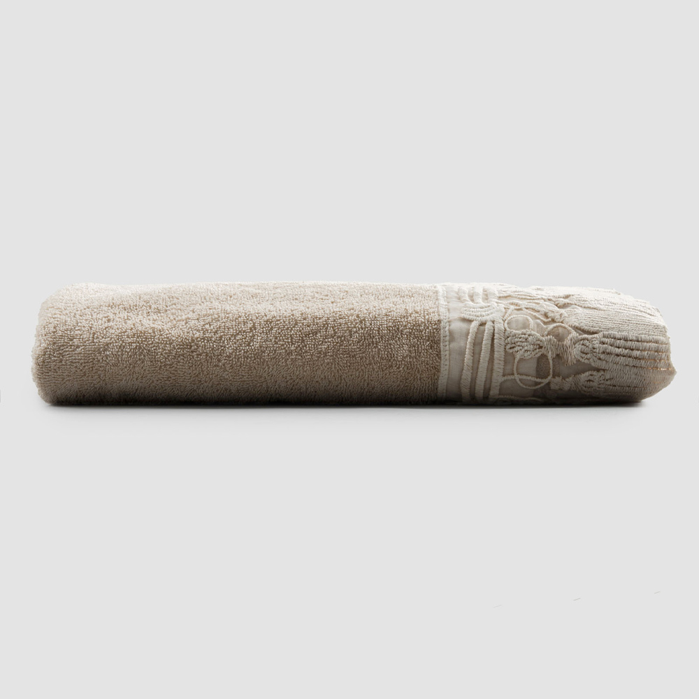 The value of tradition meets the modern lifestyle with the 'bath towel cotton terry pinkish beige colour, with edge Tassel lace for an elegant and luxurious style.
