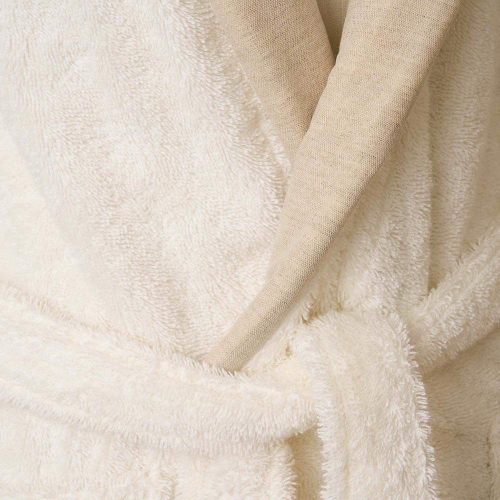 The detail that makes this gown truly special is the pure linen flounce , which not only adds a subtle decorative element but also a contrast of texture that emphasises the craftsmanship and high quality of the product. The combination of cotton and linen not only guarantees durability and resistance, but also exceptional comfort, with superior absorbency that leaves you dry and wrapped in pure sweetness.